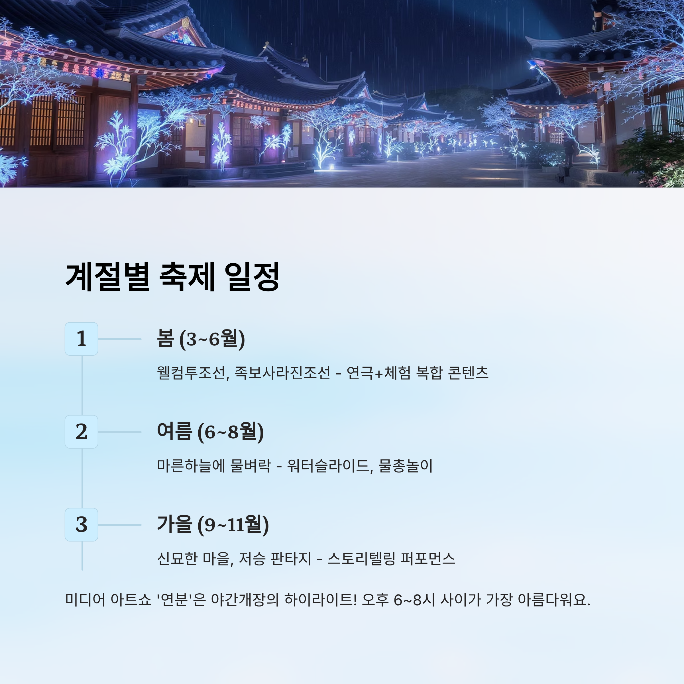 가족 단위 방문객이라면 ‘조용한 뒷길 산책 + 한복 인증샷 + 연분 미디어쇼’ 위주로, 공포 강도 낮은 콘텐츠만 골라 체험해도 충분히 만족할 수 있어요. 어린 자녀가 있다면 미디어아트 중심 구역 위주로 동선을 짜면 좋아요.