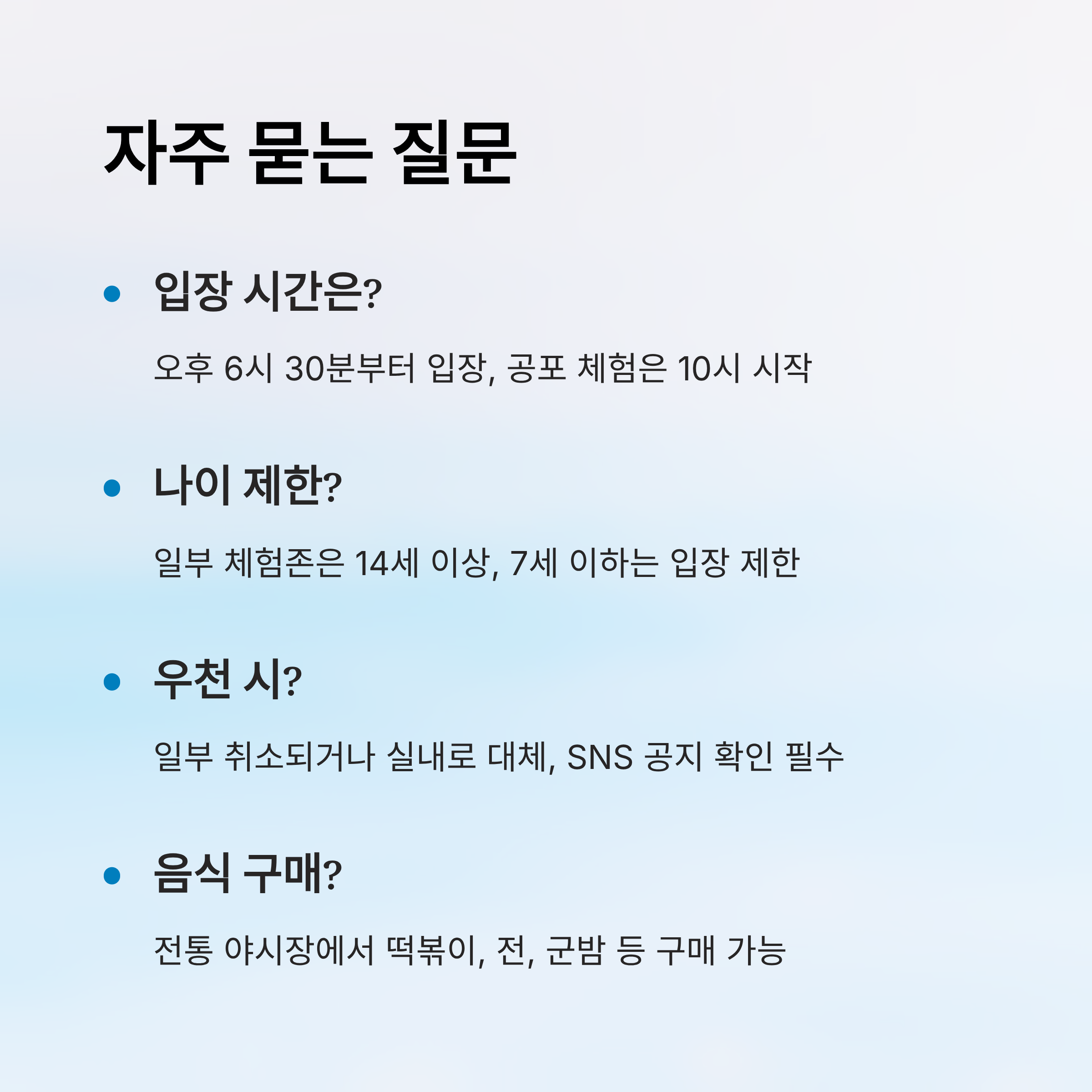 A4. 우천 시에는 일부 체험과 공연이 취소되거나 실내 콘텐츠로 대체돼요. 심한 기상이변일 경우 전체 일정이 조정될 수 있으니, 방문 전 SNS나 홈페이지 공지를 꼭 확인해주세요.