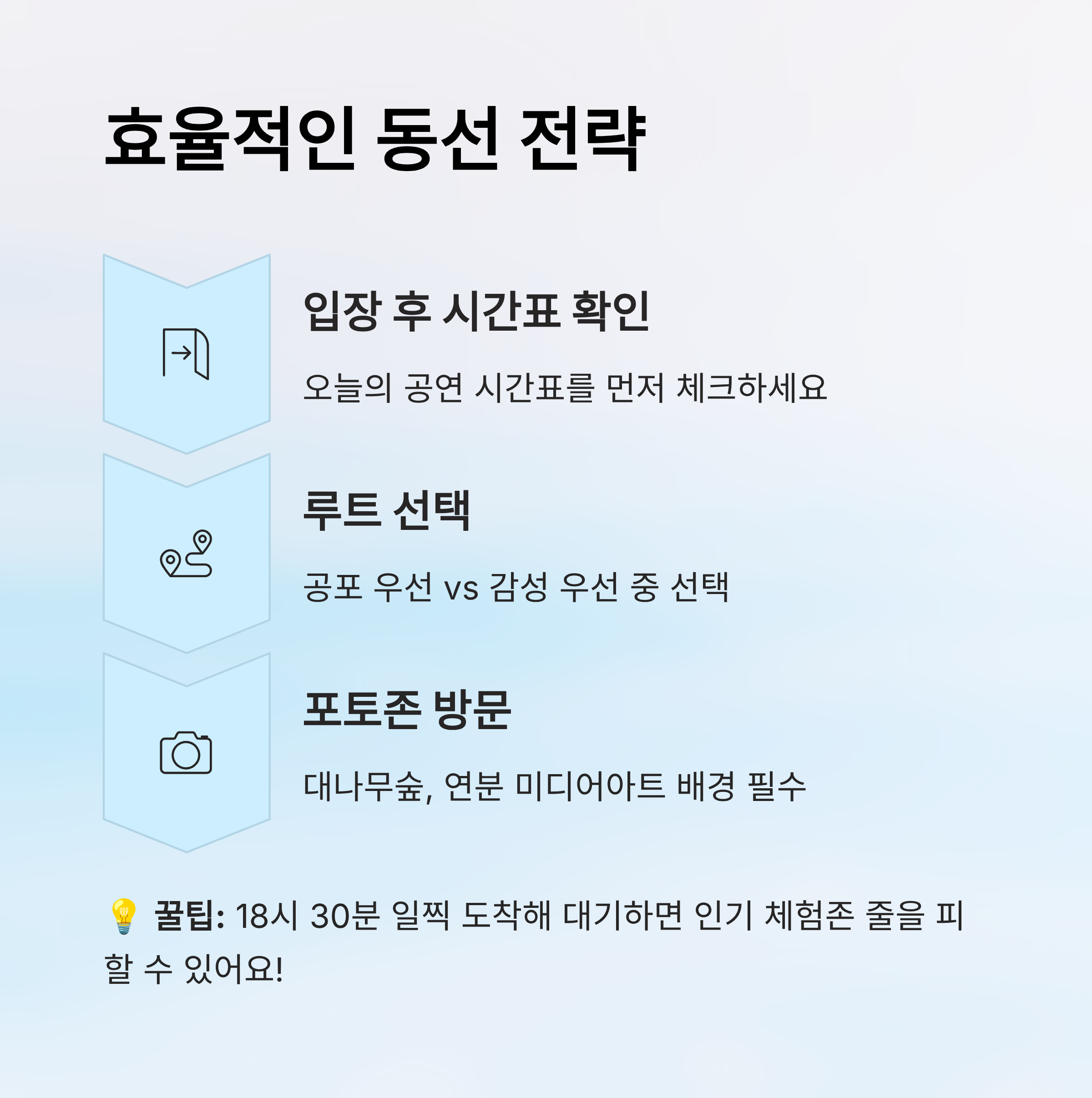 🎯 동선 추천은 크게 두 가지 타입이 있어요. 첫 번째는 **'고강도 공포체험 우선' 루트**예요. 이 루트는 공포존을 먼저 빠르게 클리어하고 이후에 조선 야경을 천천히 감상하는 방식이에요. 두 번째는 **‘무서움 덜한 순한맛 루트’**로, 야경·포토존을 먼저 즐기고 마지막에 한두 개의 공포존을 도전하는 방식이에요.
