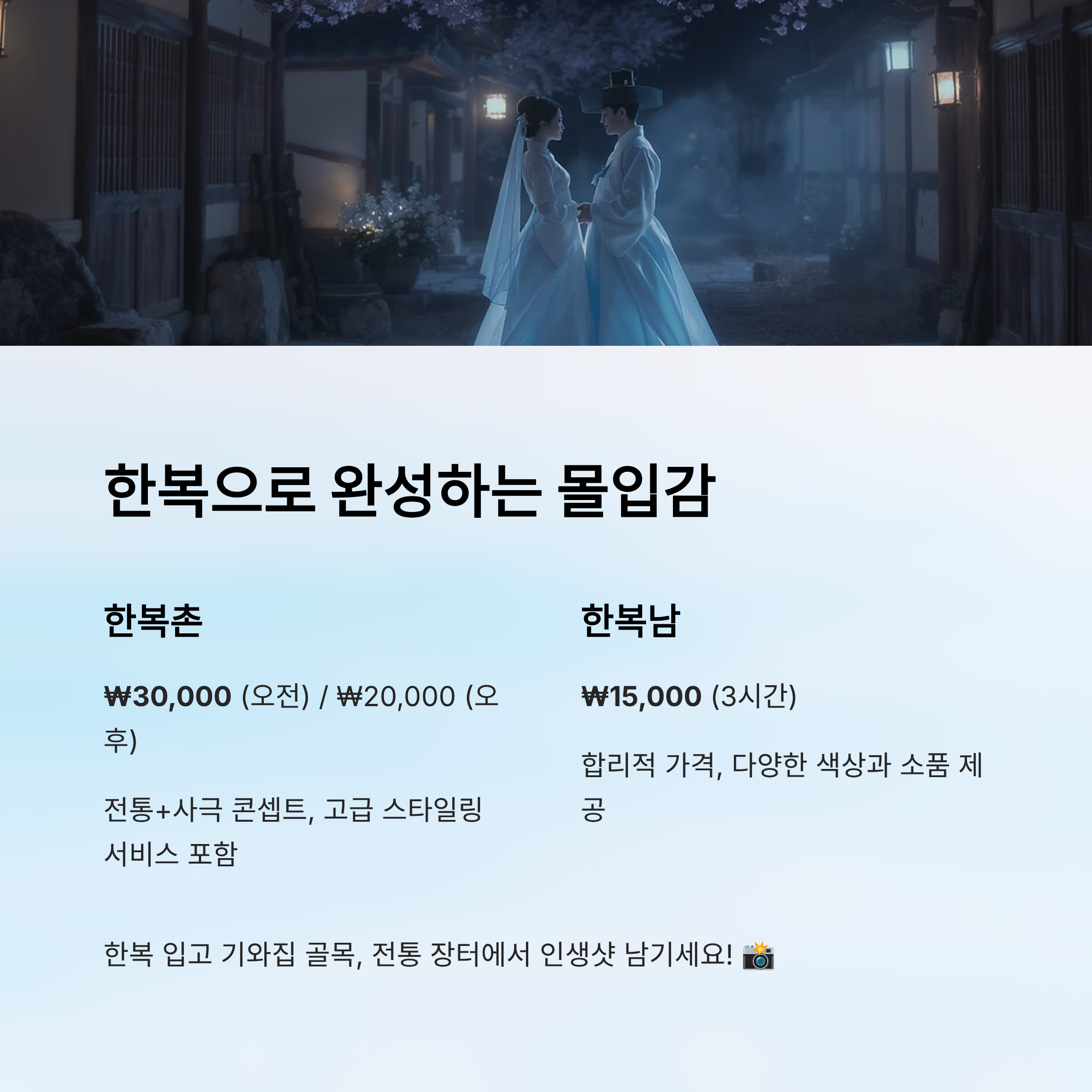 | 한복남 | 민속촌 내부 상가마을 뒤편 | 10:00 ~ 18:00 | ₩15,000 (3시간 기준) | 합리적 가격, 소품 포함 |