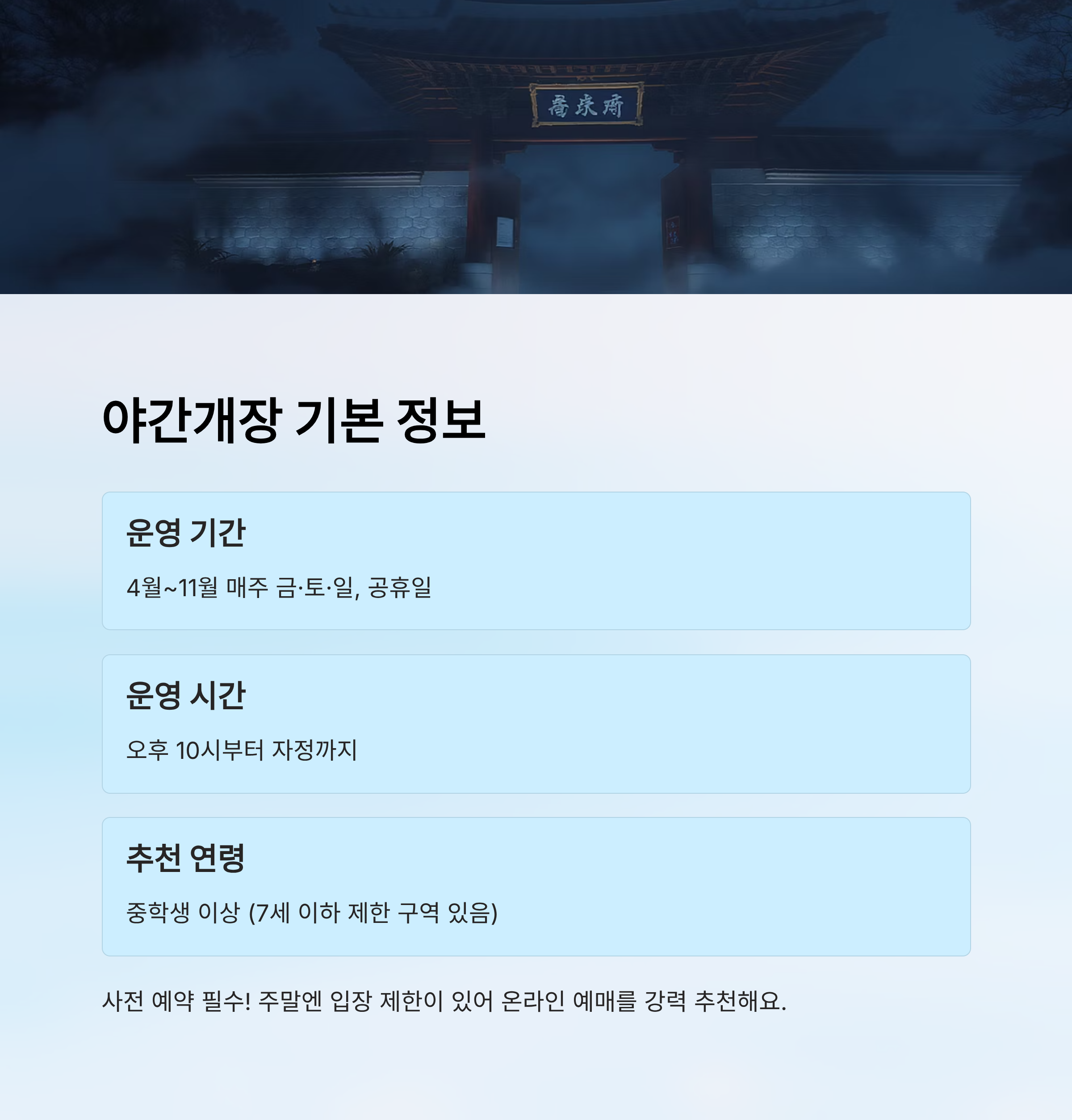 민속촌 야간개장은 단순히 무서운 것만이 아닌, 체계적인 동선과 전략적인 시간 활용이 필요한 고품질 야외공연이자 경험이니, 준비만 잘 하면 누구나 만족할 수 있어요! 😎
