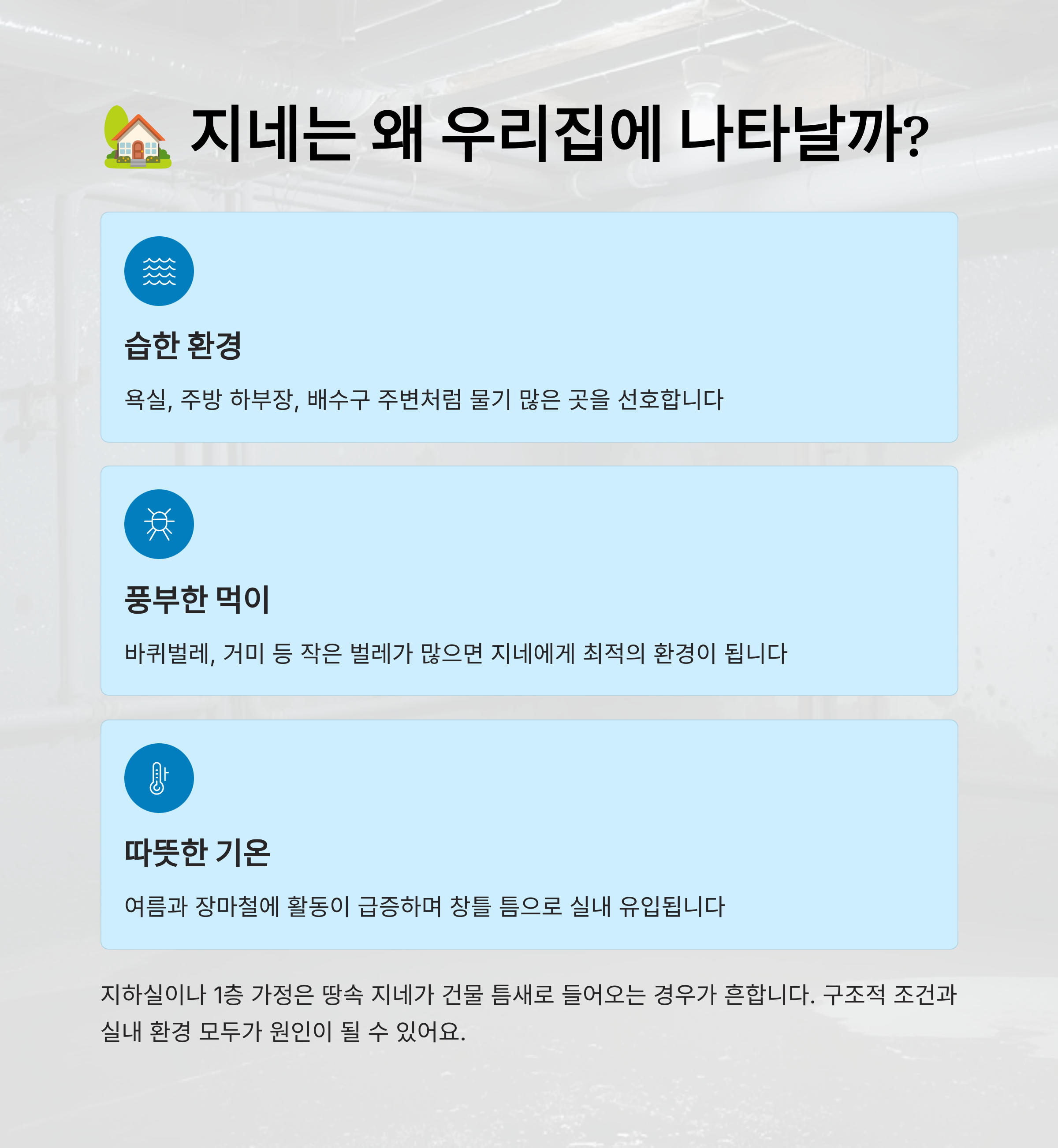 지하실이 있는 구조나 1층에 위치한 가정이라면 더더욱 지네 출몰 가능성이 높아요. 땅속에서 서식하던 지네가 건물 틈새를 타고 들어오는 경우가 흔하거든요. 따라서 구조적인 조건과 실내 환경이 모두 원인이 될 수 있어요.