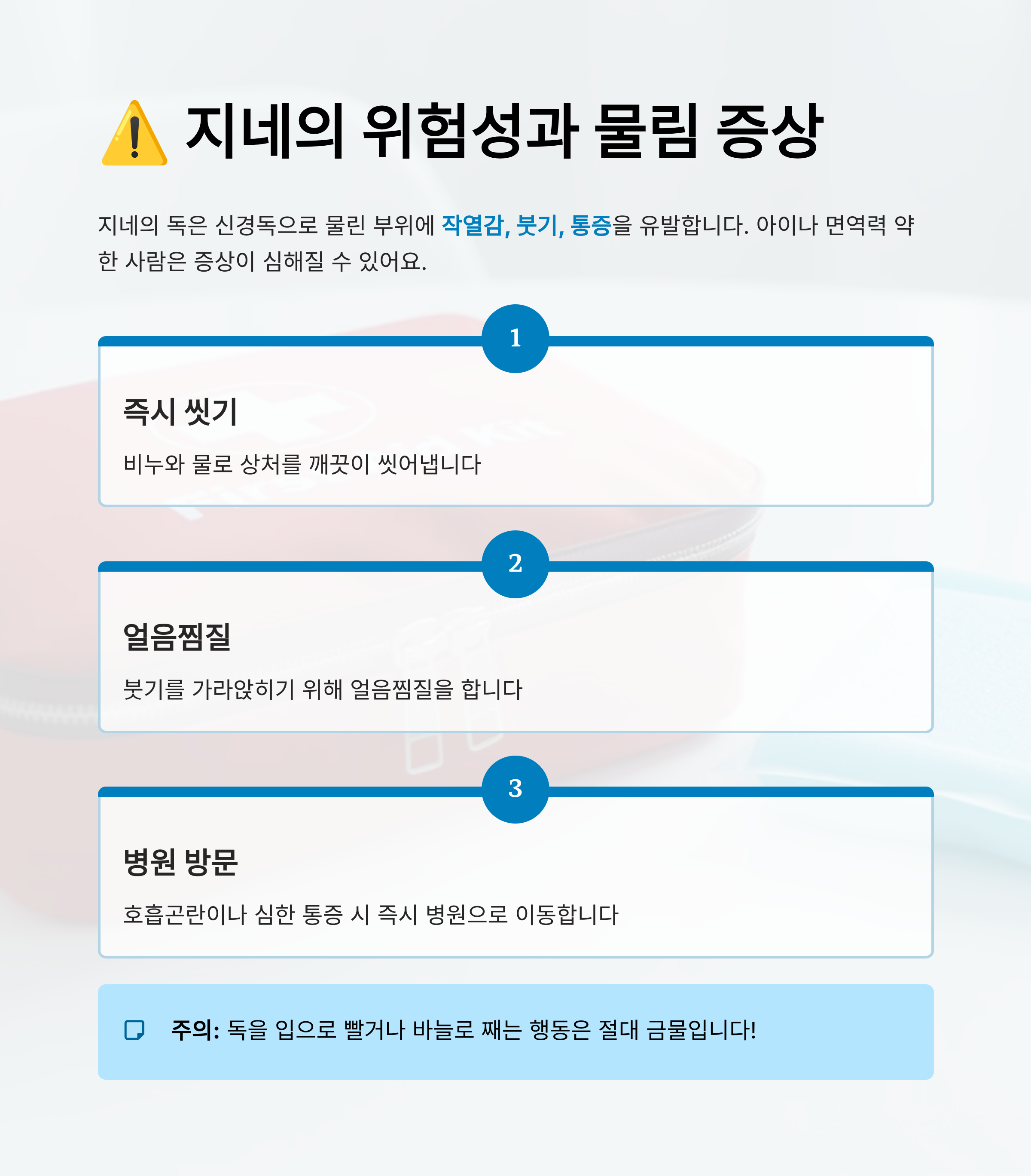 물렸을 경우 응급처치가 중요해요. 비누와 물로 상처를 잘 씻고, 얼음찜질로 붓기를 가라앉히되, 절대 독을 입으로 빨거나 무작정 바늘로 째면 안 돼요. 증상이 심할 땐 병원을 바로 찾는 것이 안전해요.