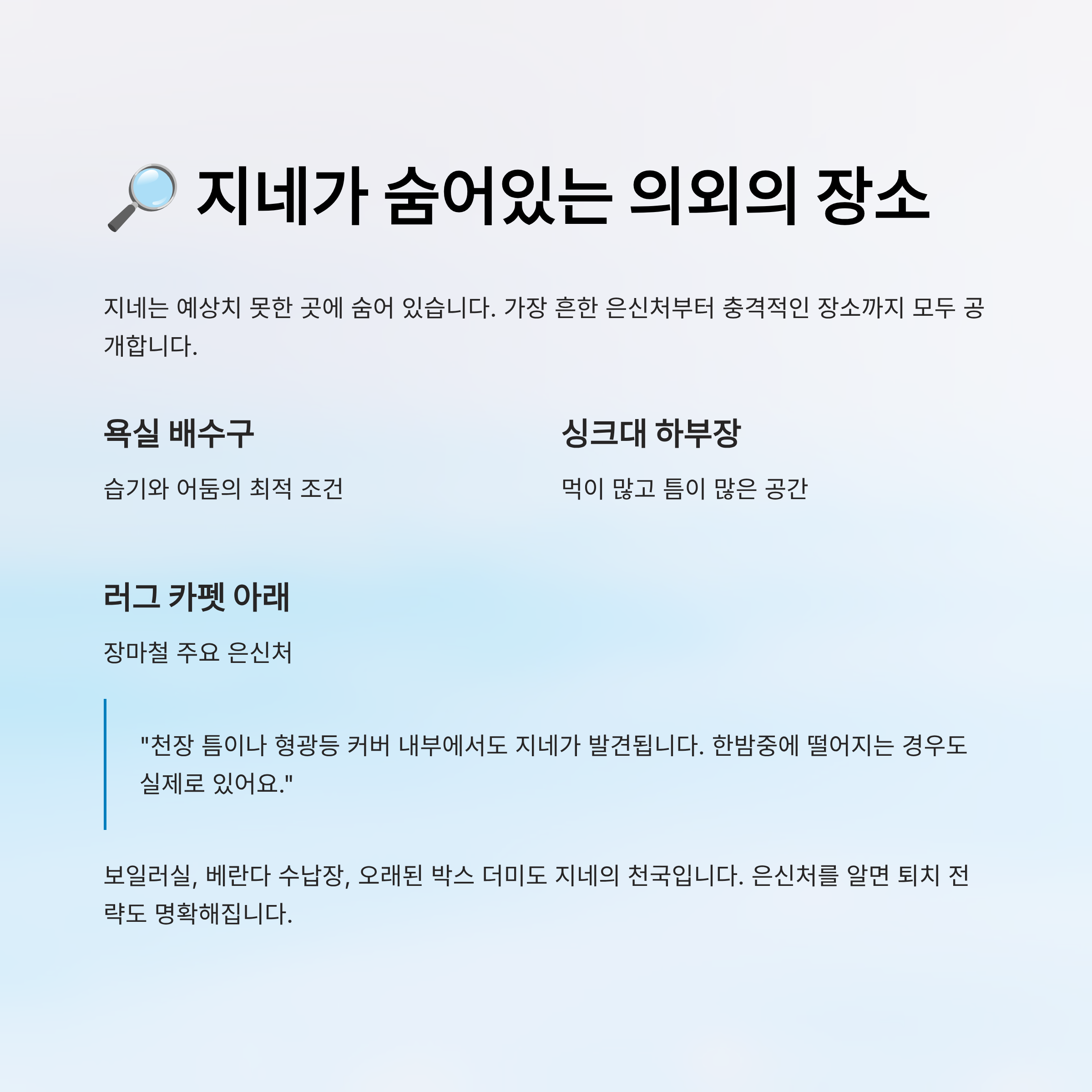 지네는 정말 예상치 못한 곳에 숨어 있는 경우가 많아요. 대부분은 "설마 여기?" 싶은 장소라서 더욱 조심해야 해요. 가장 흔한 장소는 욕실 배수구, 화장실 뒷편, 세탁기 아래, 싱크대 하부장이에요. 공통점은 모두 습하고 어두운 환경이라는 점이죠.