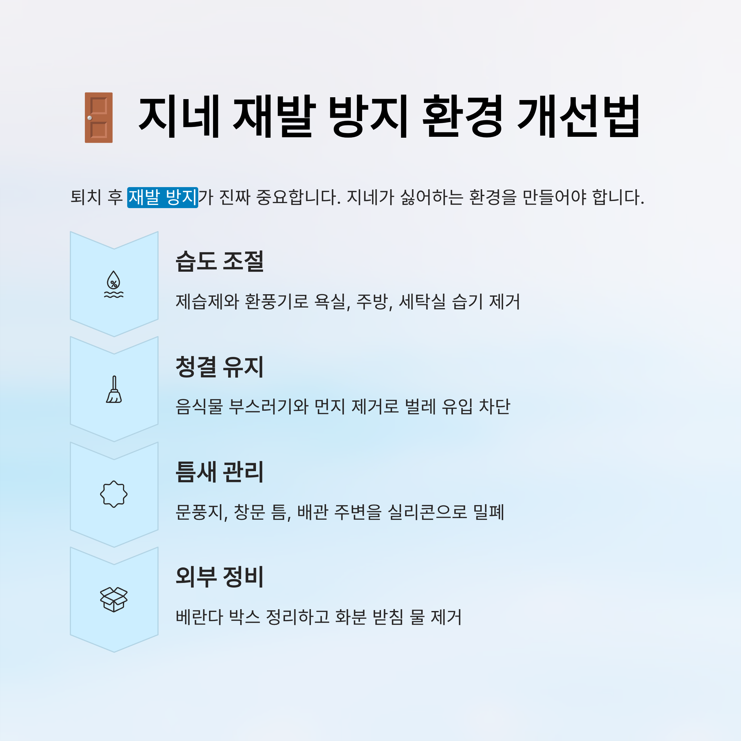 재발 방지는 퇴치보다 더 꾸준한 관리가 필요해요. 지네가 다시는 우리집을 선택하지 않도록 철저히 대비해보세요! 💪