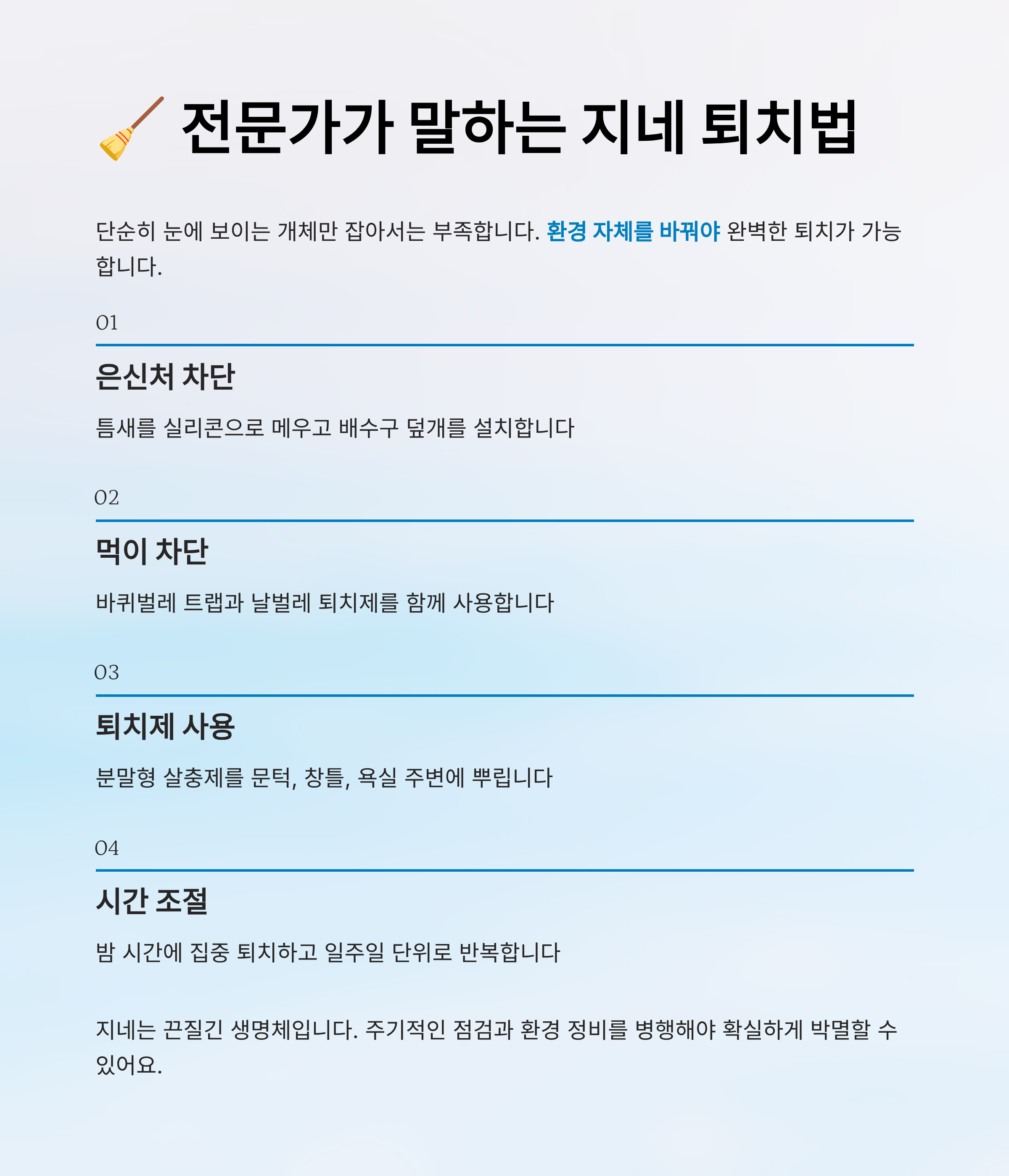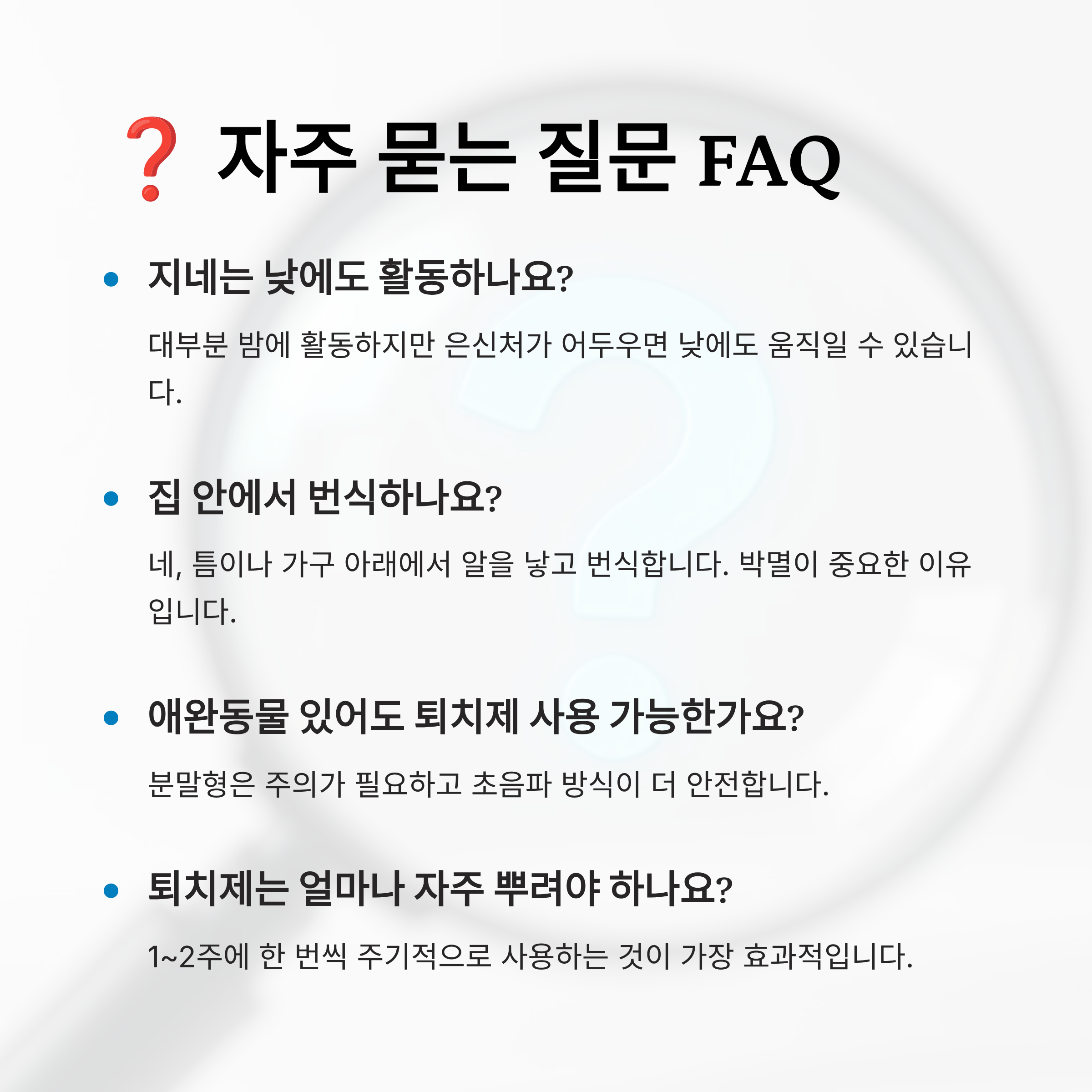 지네는 끈질기고 민첩한 생명체라, 한 번 퇴치했다고 끝난 게 아니에요. 주기적인 점검과 환경 정비를 병행해야 확실하게 박멸할 수 있어요. 전문가처럼 행동해보세요!🧤