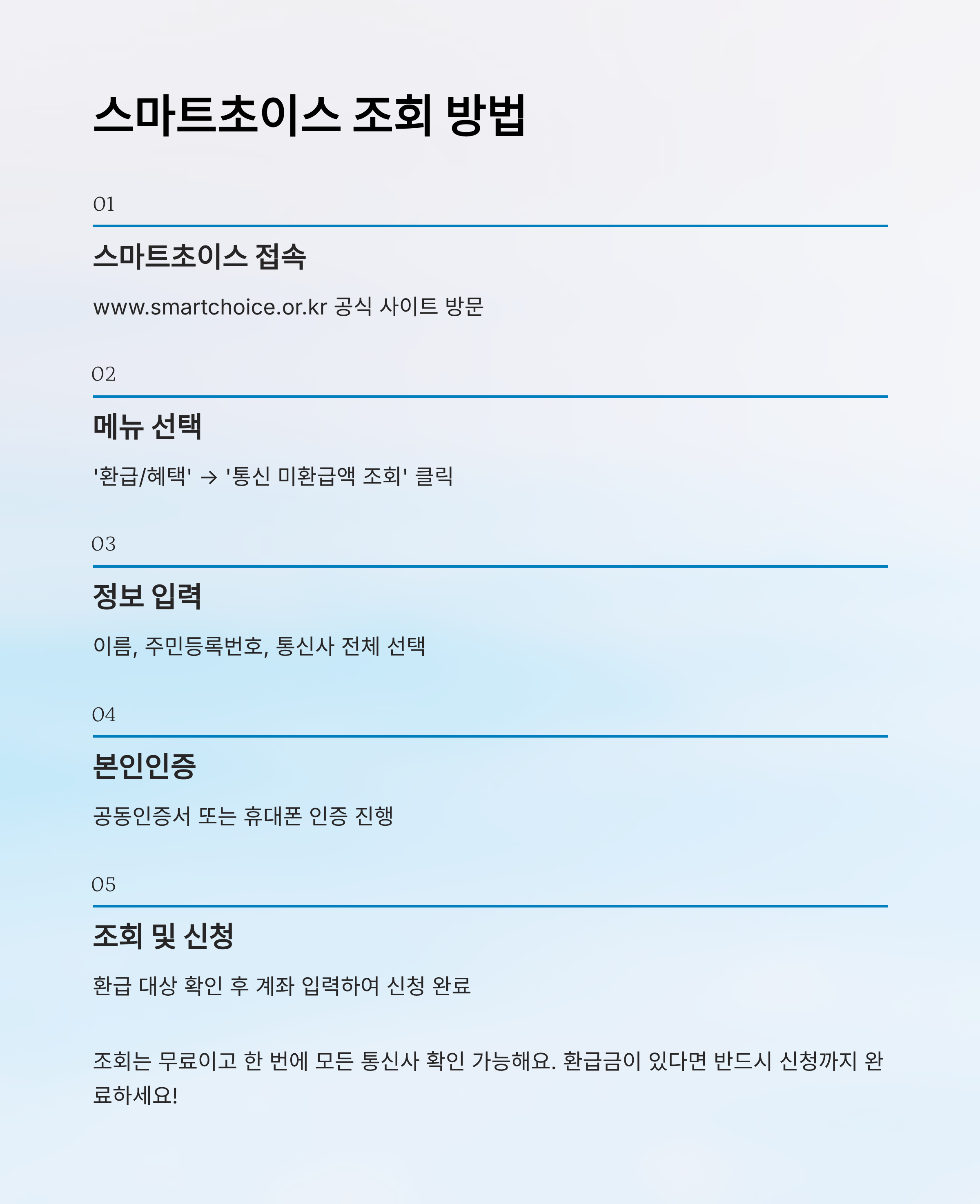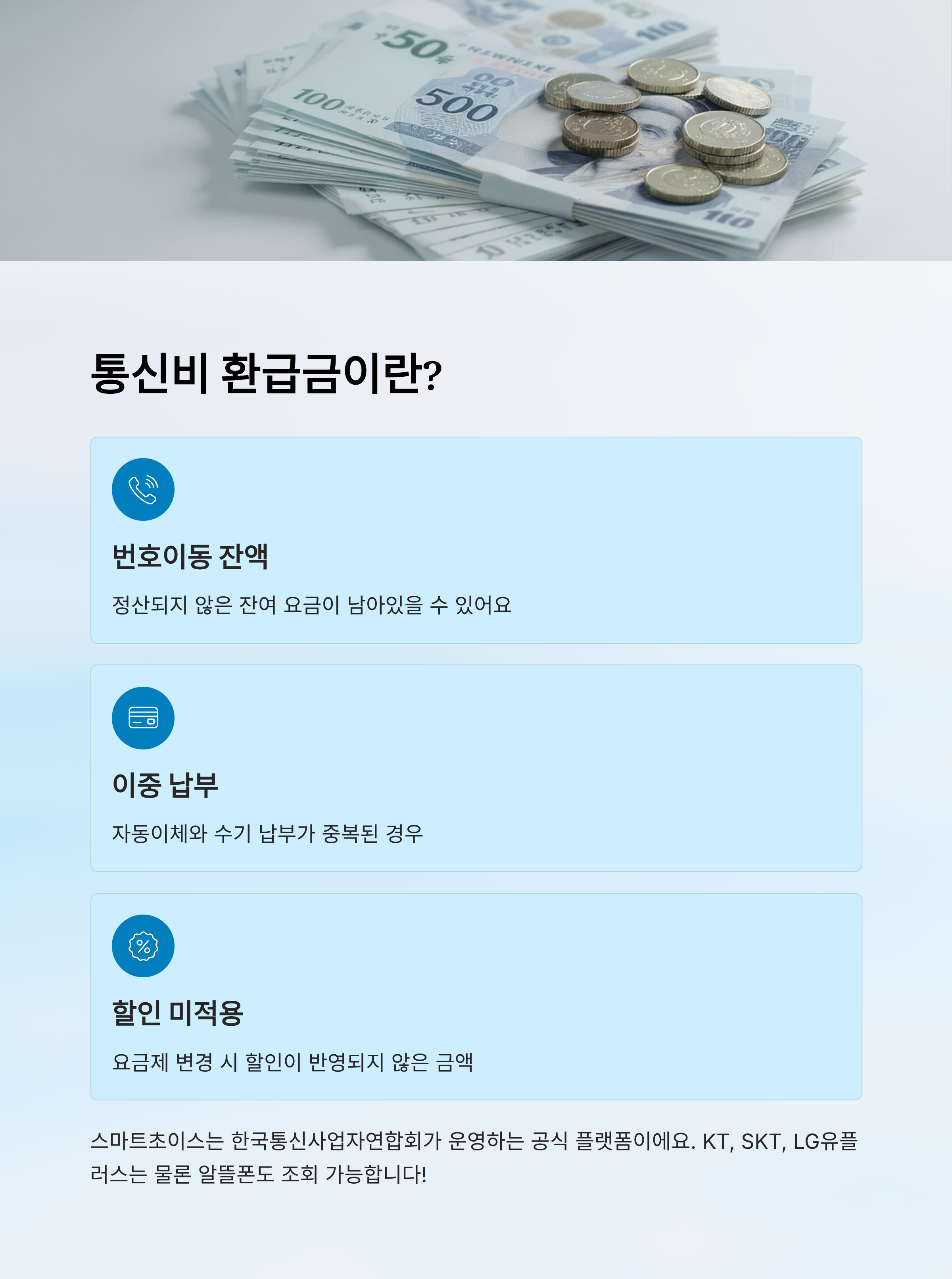 본 콘텐츠는 통신비 미환급금 제도와 관련한 정보를 알기 쉽게 전달하기 위한 목적으로 작성되었으며, 실제 환급 가능 여부는 개인의 통신 이력 및 통신사 정책에 따라 달라질 수 있습니다. 정확한 정보와 신청 방법은 반드시 해당 통신사 및 공식 홈페이지인 스마트초이스(www.smartchoice.or.kr)를 통해 확인해 주세요. 본 콘텐츠에 기재된 내용은 2025년 10월 기준이며, 이후 정책 변경 시 달라질 수 있어요.