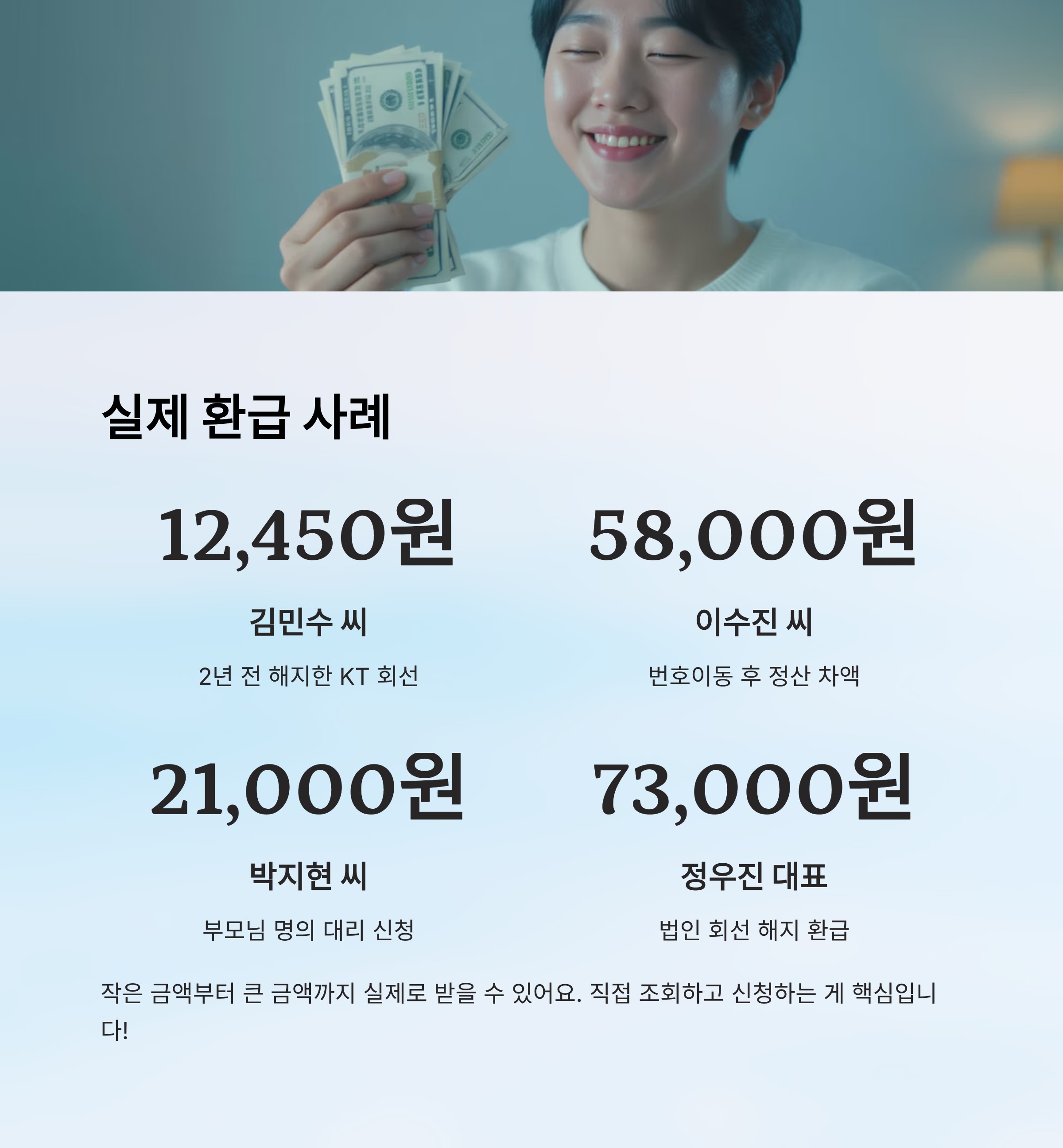 📍 **사례 1 – 2년 전 해지한 회선, 12,450원 환급 성공!** 서울에 거주 중인 김민수 씨는 2023년에 KT 회선을 해지했는데, 최근 스마트초이스에서 조회해 보니 12,450원의 미환급금이 남아 있었다고 해요. 본인 인증 후 바로 계좌로 입금됐고, “작은 금액이지만 정말 기분 좋았다”고 전했어요.