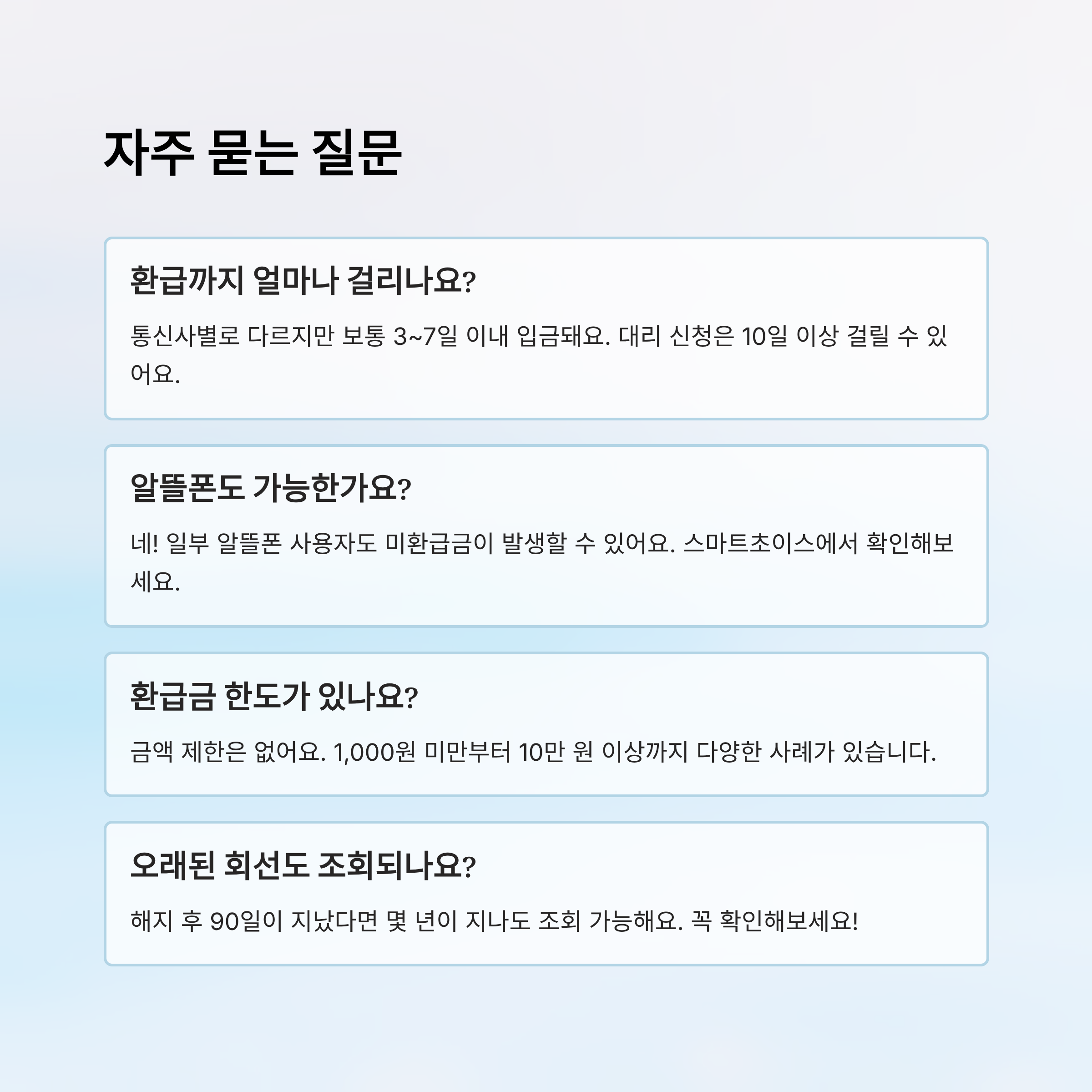 A3. 네! 해지 후 90일이 지난 회선이라면 몇 년이 지나도 미환급금이 존재할 수 있어요. 시스템에 등록된 한, 조회 및 환급이 가능하니 오래된 회선도 꼭 확인해보세요.