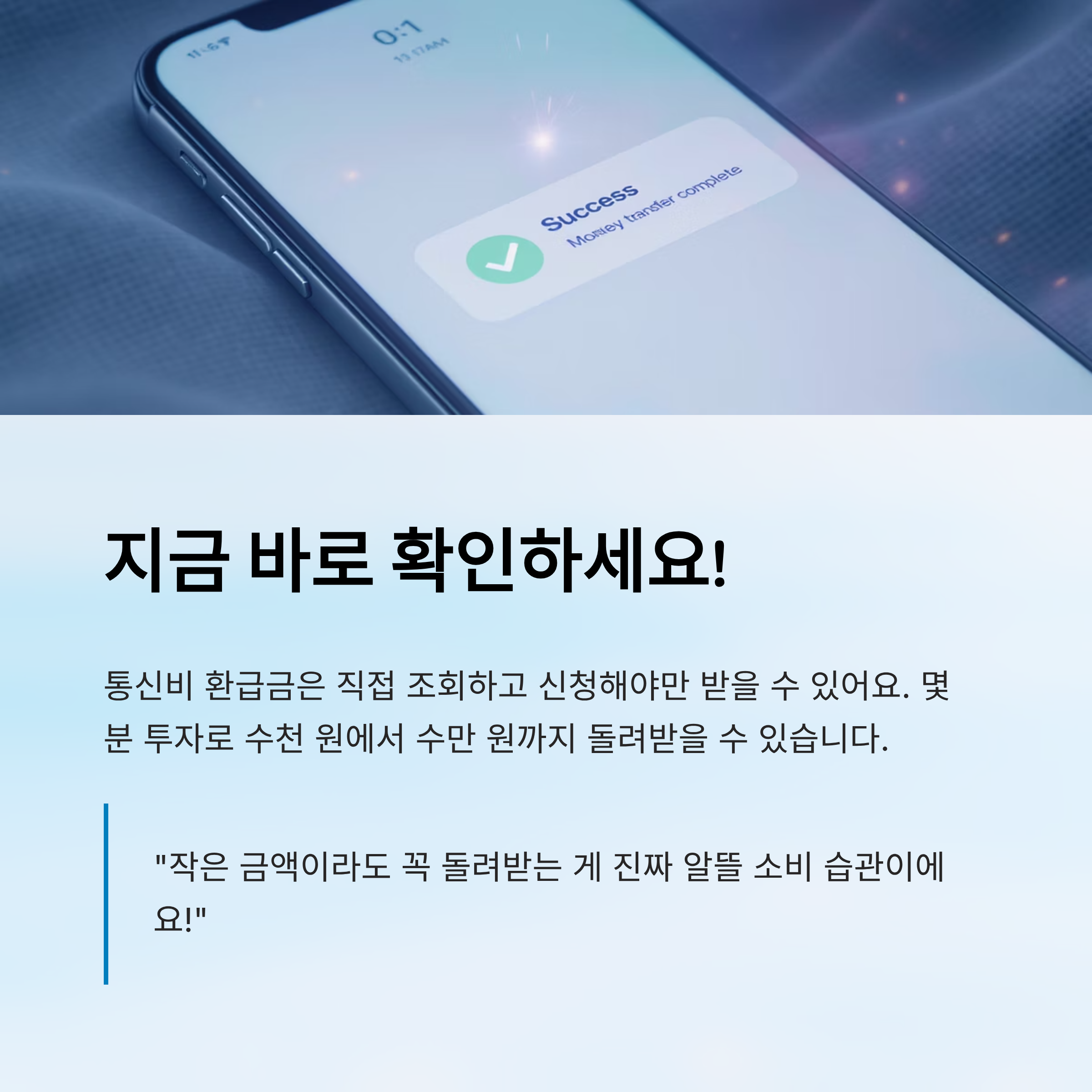 이처럼 통신비 환급금은 액수가 크든 작든 실제로 받을 수 있어요. 중요한 건 ‘직접 조회’하고 ‘신청’하는 거예요. 누군가 알려주지 않으면 절대 몰랐을 돈이니까요. 😊