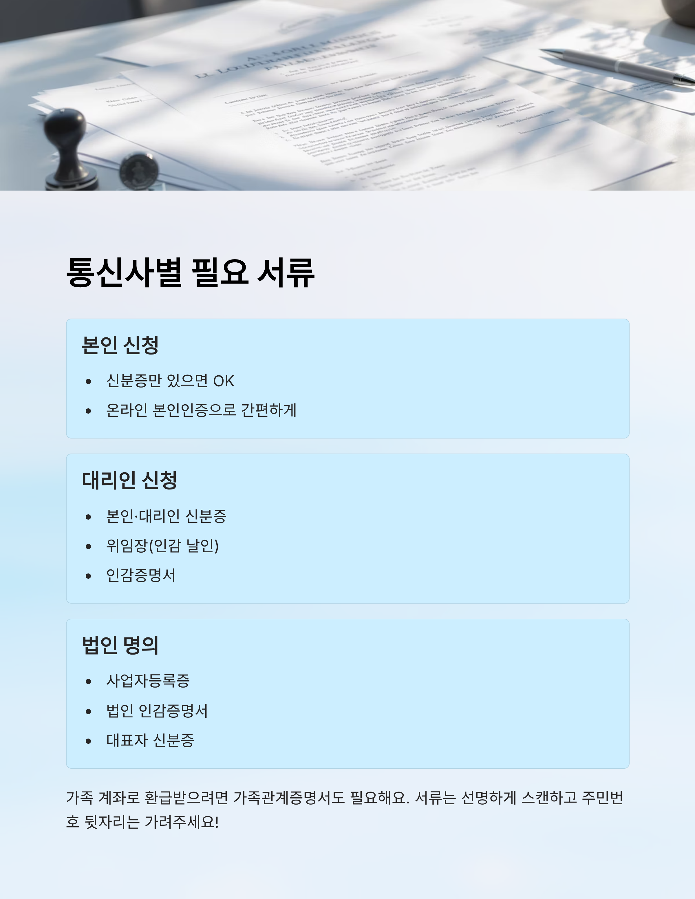 KT, SK텔레콤, LG유플러스 모두 공통적으로 신분증은 필수이며, 대리 신청 시에는 위임장과 인감증명서가 꼭 들어가야 해요. 가족 계좌로 환급을 받으려는 경우라면 가족관계증명서도 요구돼요. 📎