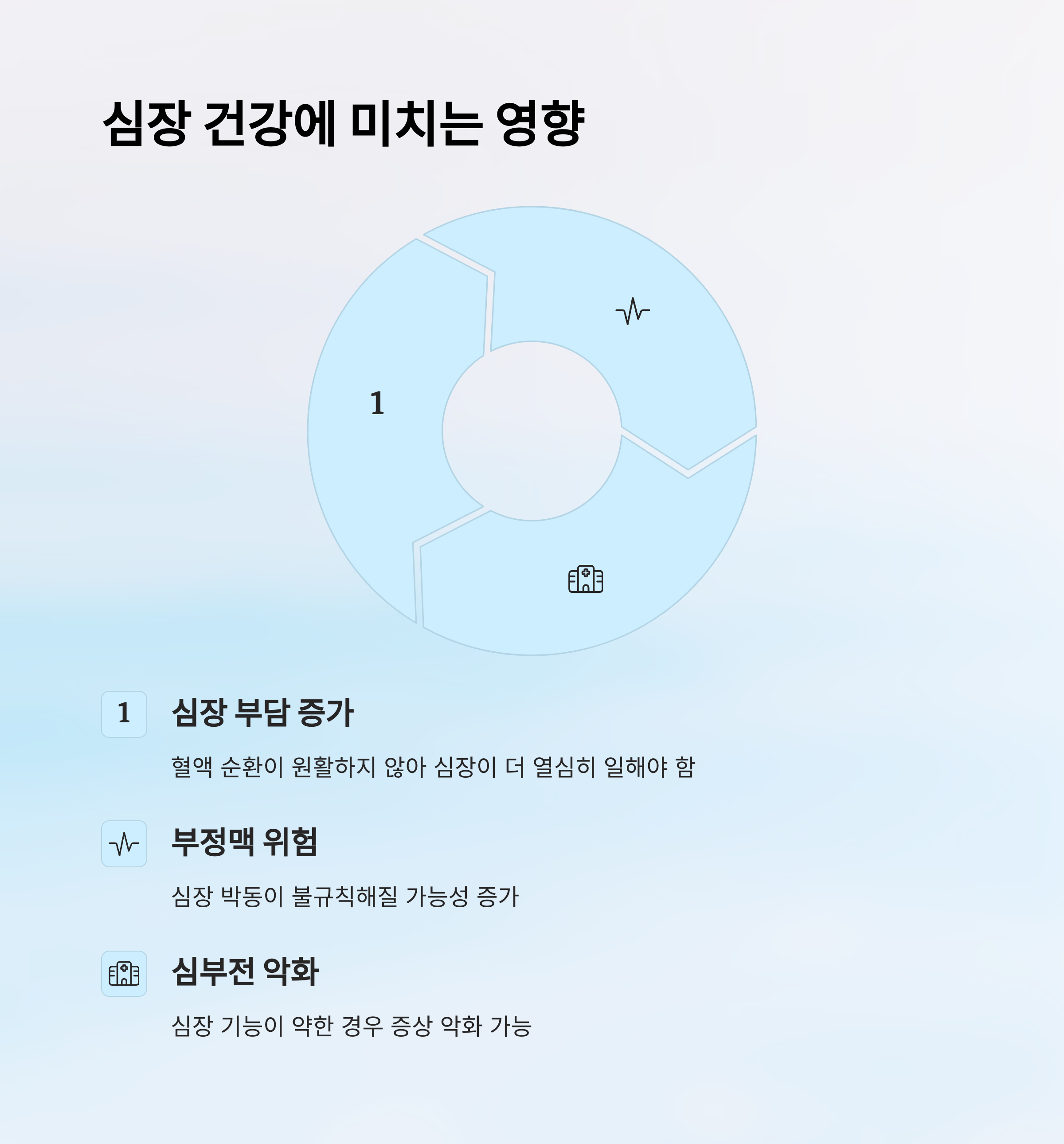 | 심장 부담 증가 | 혈액 순환이 원활하지 않아 심장이 더 열심히 일해야 함 |