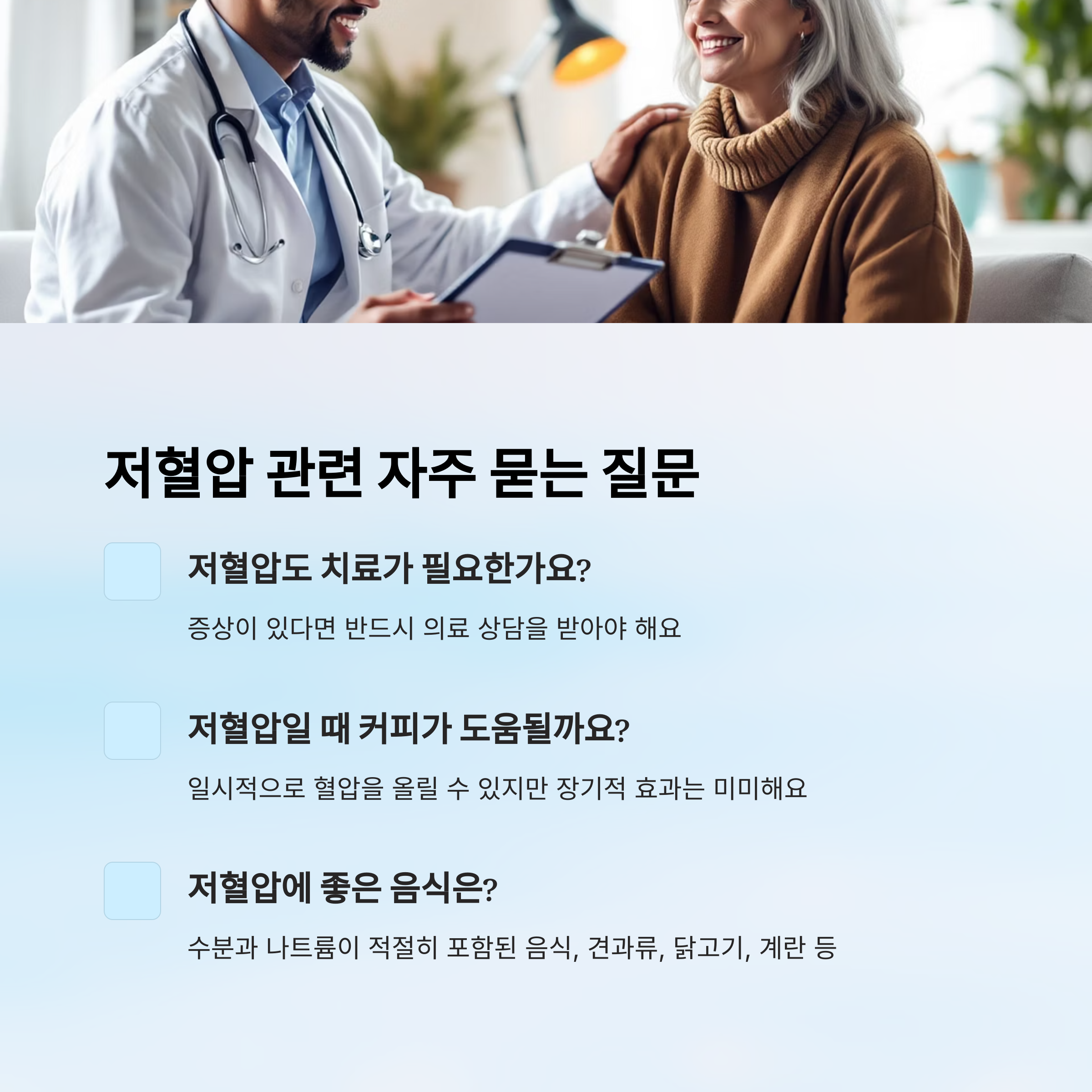 위 방법들을 실천하면 저혈압을 효과적으로 예방하고 관리할 수 있어요. 하지만 저혈압 증상이 심하거나 일상생활에 불편을 준다면 반드시 의사와 상담하는 것이 좋아요.