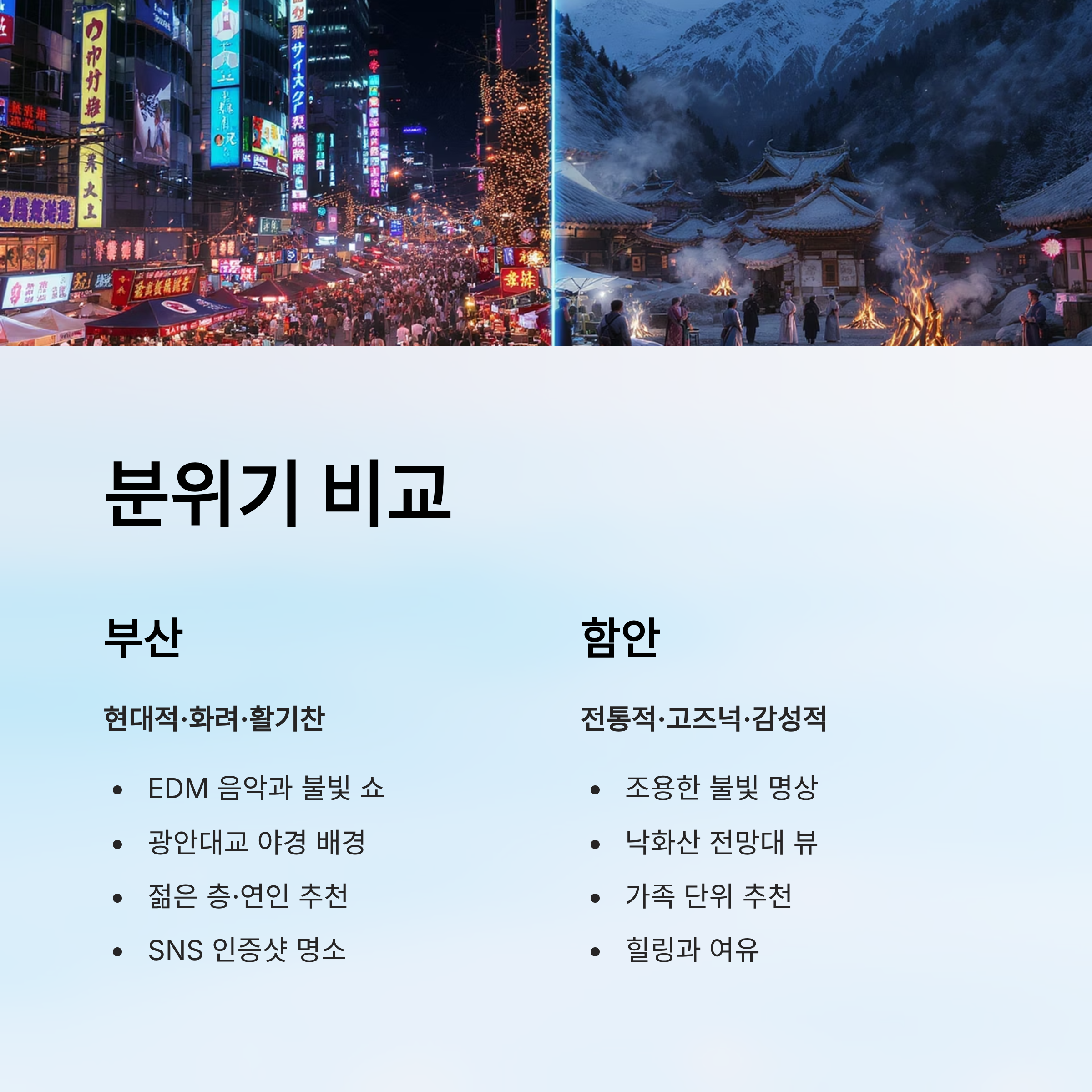 분위기를 요약하자면, 부산은 ‘활기찬 축제의 도시’, 함안은 ‘고즈넉한 불빛의 마을’이에요. 부산은 친구, 연인끼리 함께 놀기에 좋고, 함안은 가족 단위나 조용한 나들이를 원하는 사람에게 좋아요.