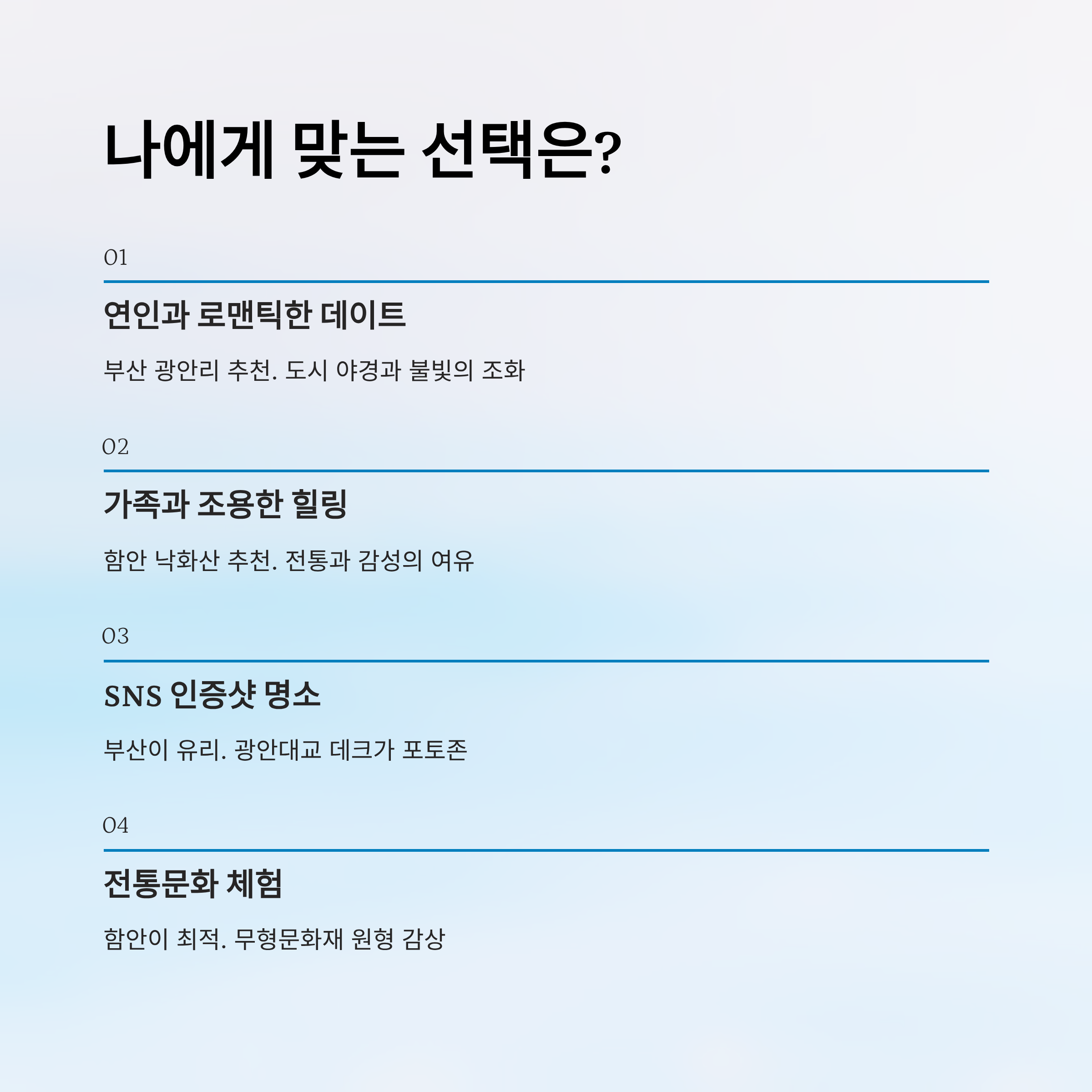 결정을 도와드릴게요. 여행 목적에 따라 간단히 구분할 수 있어요. 연인과 로맨틱한 밤을 보내고 싶다면 부산이 좋아요. 도시 야경과 불빛이 함께 어우러지는 순간이 정말 잊히지 않아요. 반면 가족이나 어르신과 함께라면 함안이 훨씬 편하고 조용해요.