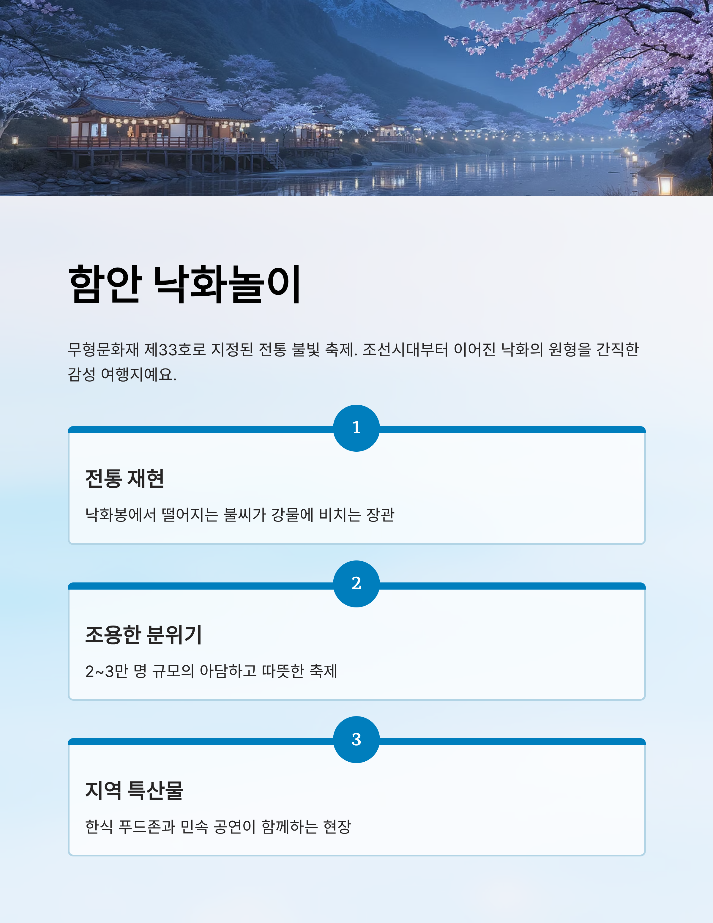 함안 낙화놀이는 ‘무형문화재 제33호’로 지정된 전통 불빛 축제예요. 조선시대부터 이어져 온 행사로, 낙화봉에서 떨어지는 불꽃이 강물 위에 비치는 모습이 장관이에요. 부산이 현대적이고 화려한 축제라면, 함안은 고즈넉하고 전통적인 감성을 자랑해요. 낙화놀이의 원형을 그대로 간직하고 있어서, ‘진짜 낙화놀이’를 보고 싶다면 함안이 정답이에요.