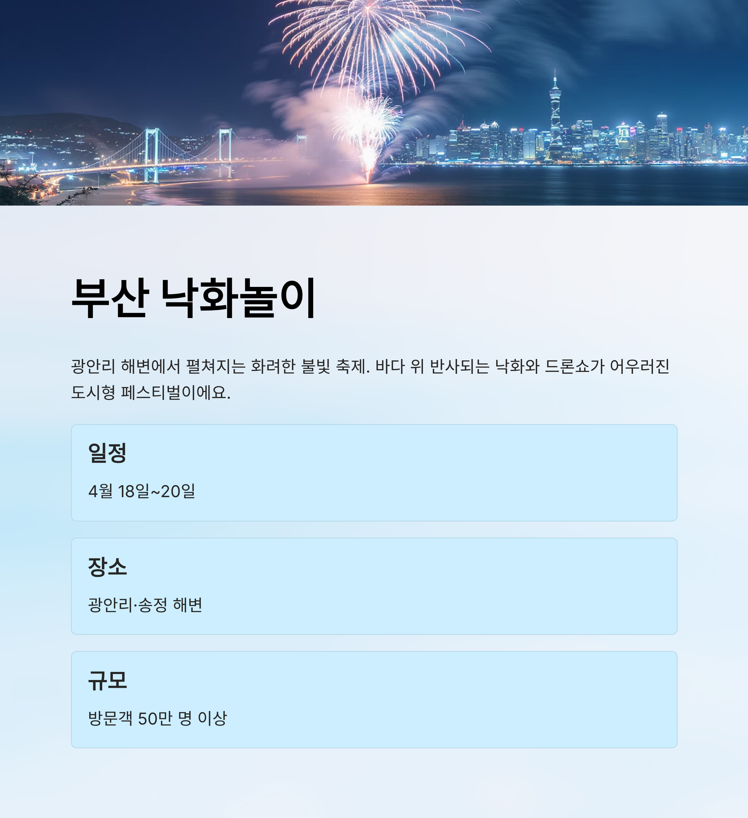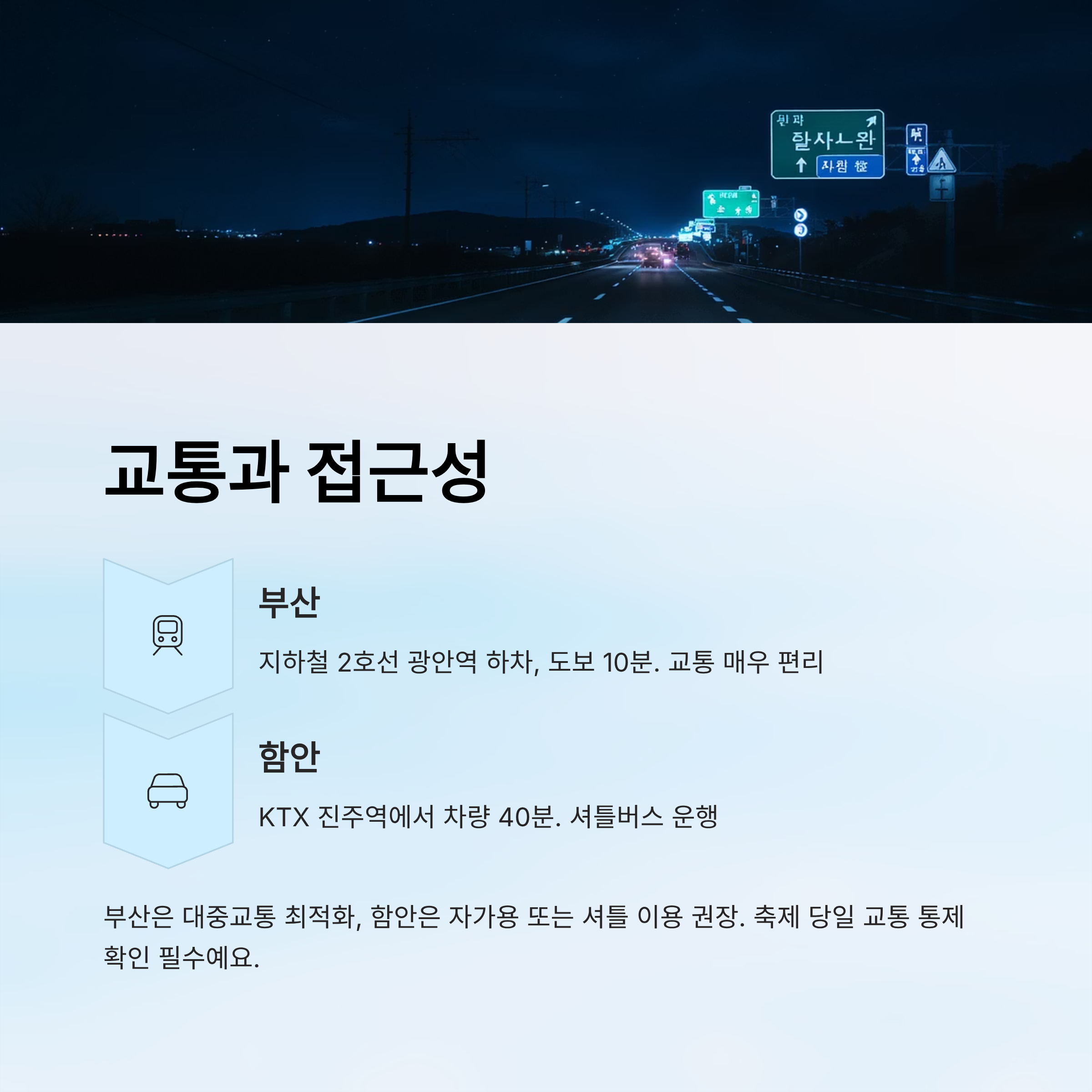 즉, 부산은 ‘보여주는 축제’, 함안은 ‘느끼는 축제’예요. 둘 다 매력이 확실히 다르기 때문에 어떤 경험을 원하느냐가 가장 중요해요. 💬