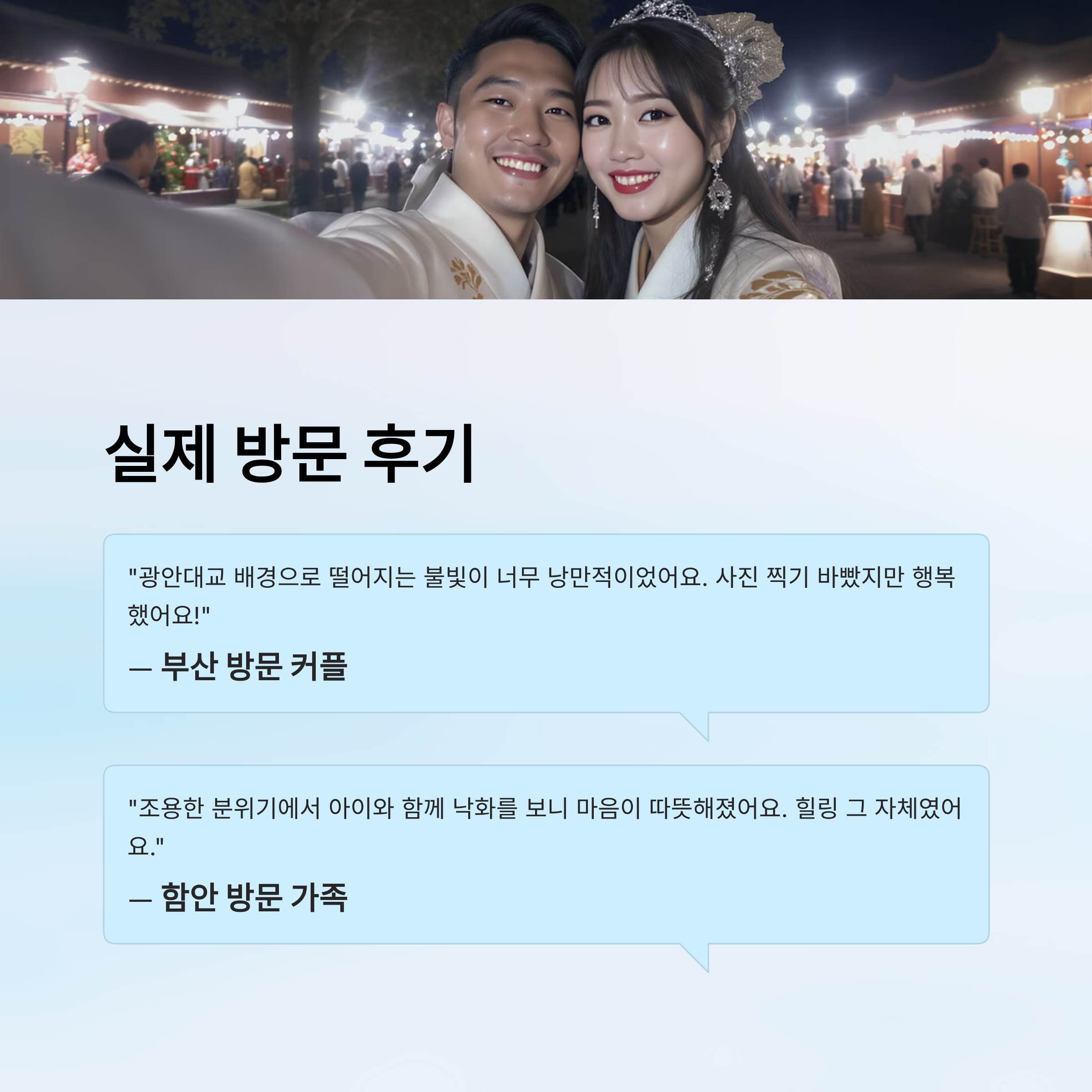 부산의 후기에는 ‘화려하다’, ‘사람이 너무 많다’, ‘카메라 셔터 누르기 바빴다’는 말이 많고, 함안은 ‘잔잔하다’, ‘힐링된다’, ‘불빛이 눈물 날 만큼 예뻤다’는 표현이 많아요. 분위기 자체가 완전히 다르다는 거예요.