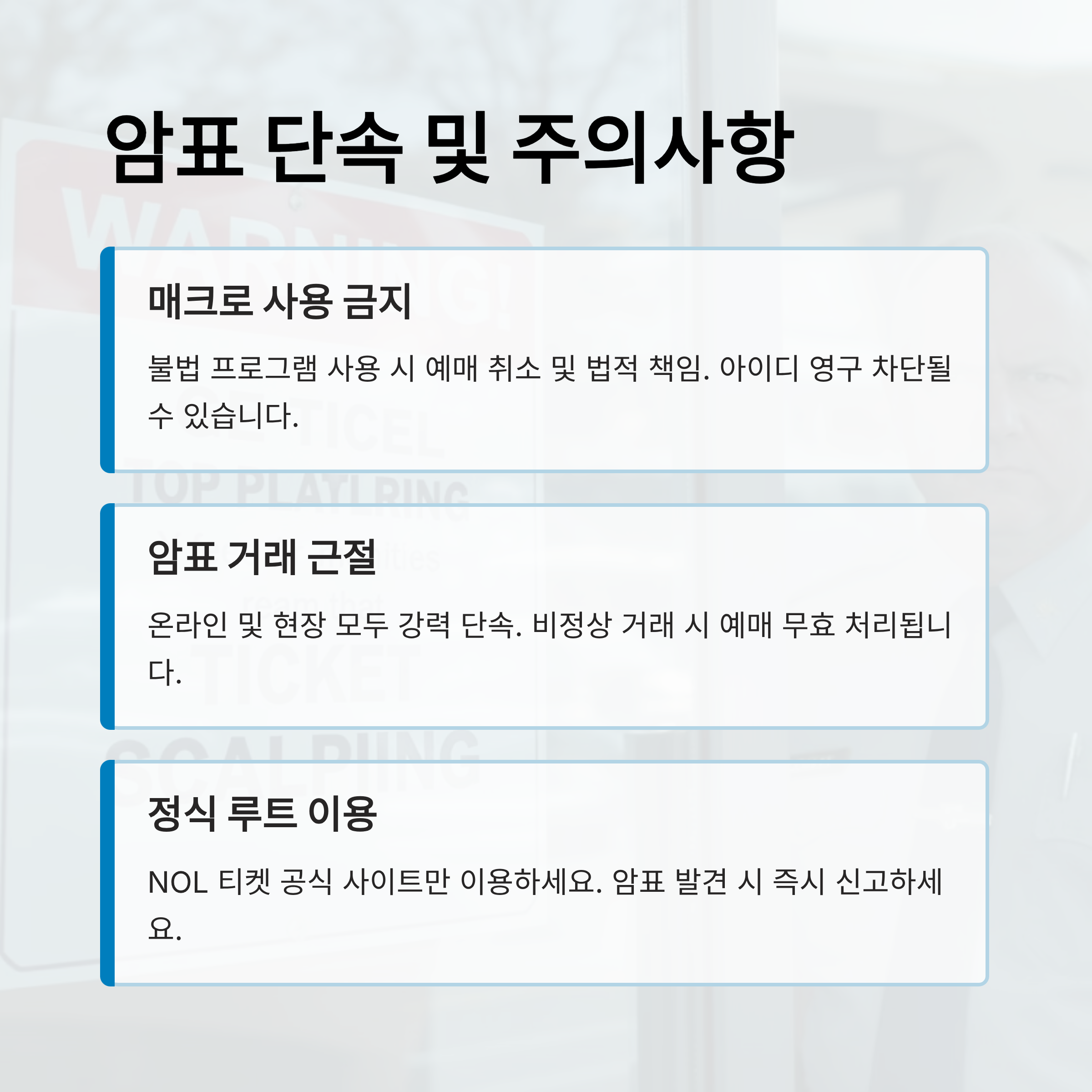 정식 예매 루트를 통해 구매하지 않으면 본인의 경기 관람 기회를 스스로 날릴 수 있어요. 암표는 사지 않고, 보이면 바로 신고하는 게 가장 좋아요!