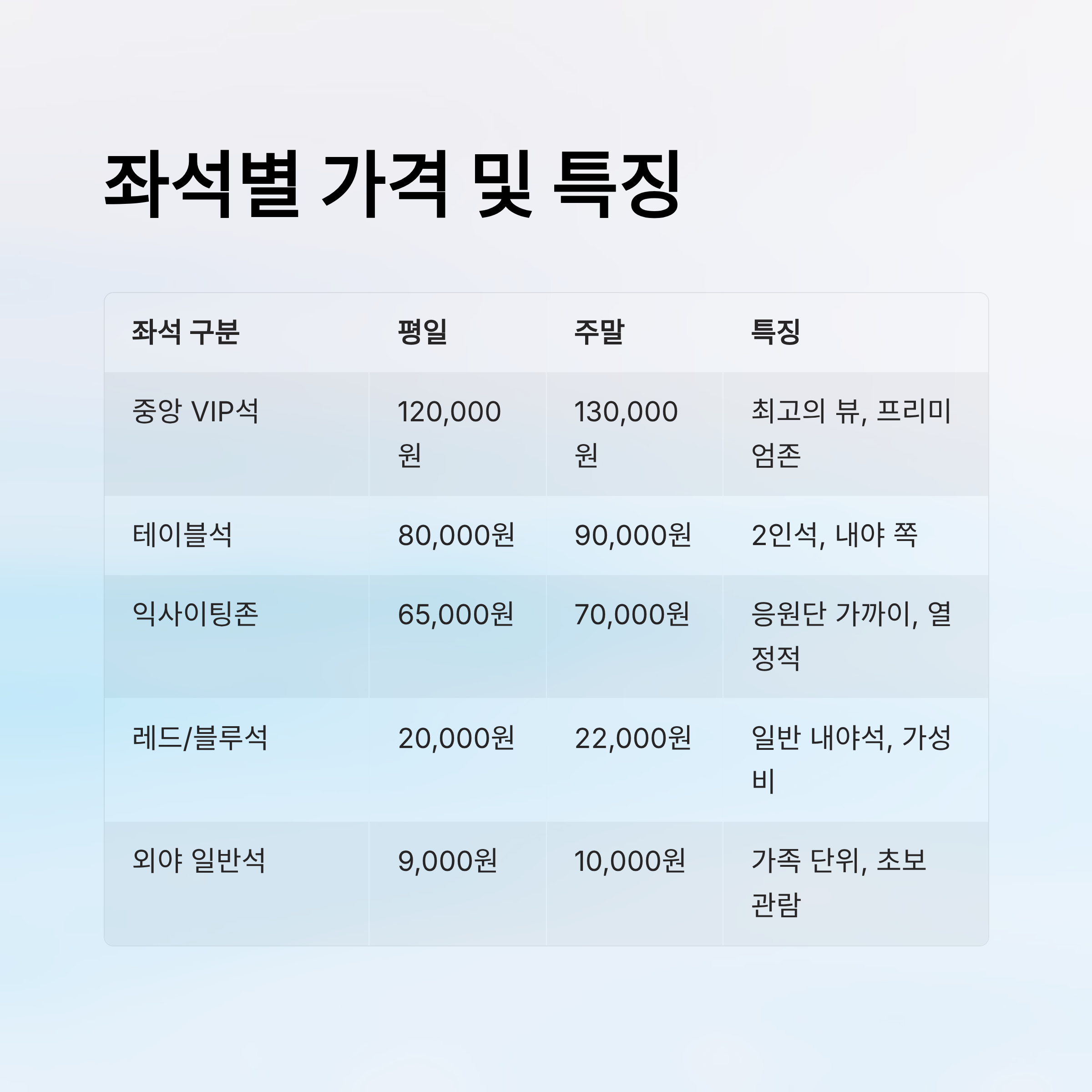 | 좌석 구분 | 평일 가격 | 주말/공휴일 가격 | 위치 및 특징 | 추천 대상 |
