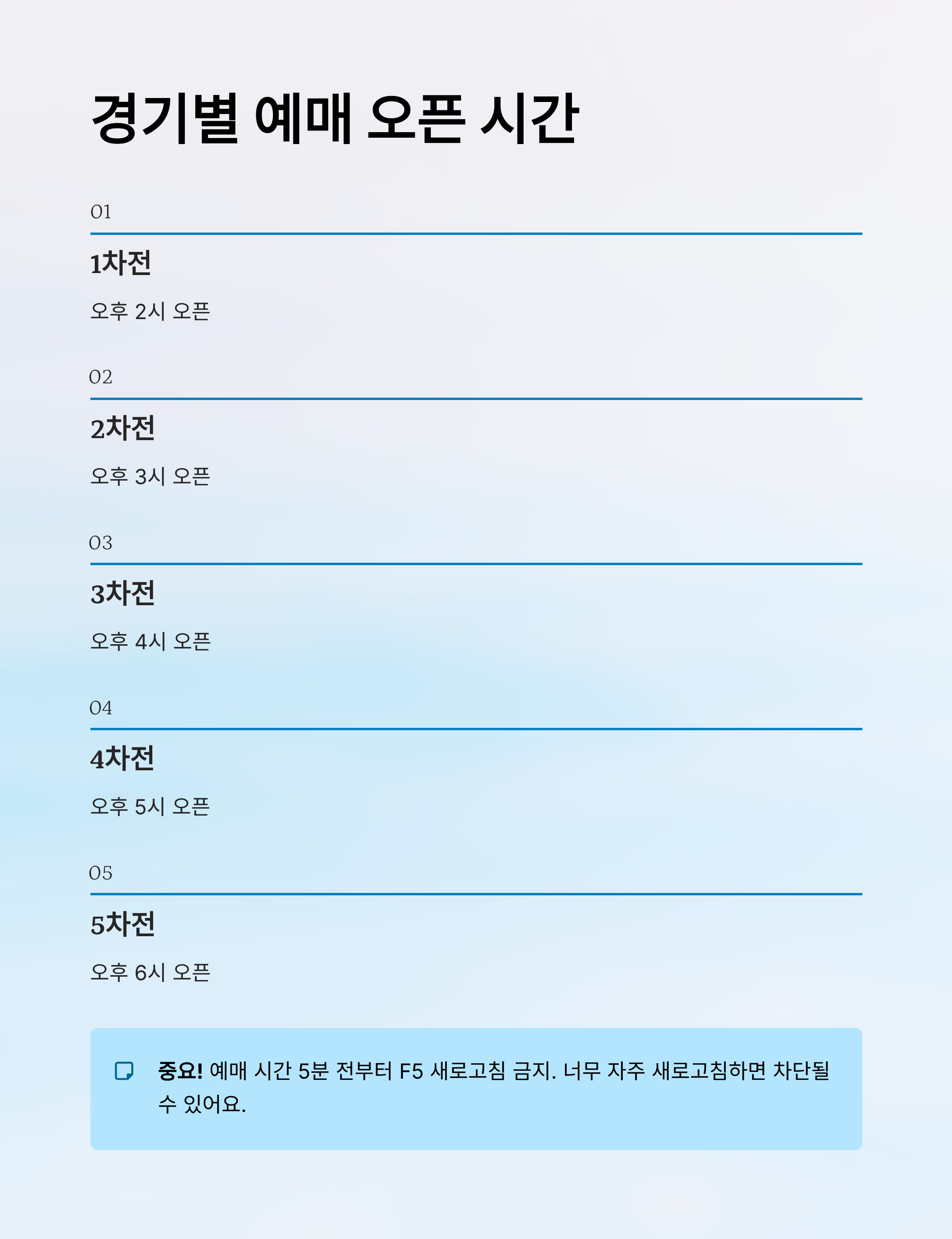 각 경기별로 시간차를 두고 오픈되니, 본인이 원하는 경기 시간에 정확히 맞춰 대기해야 해요.
