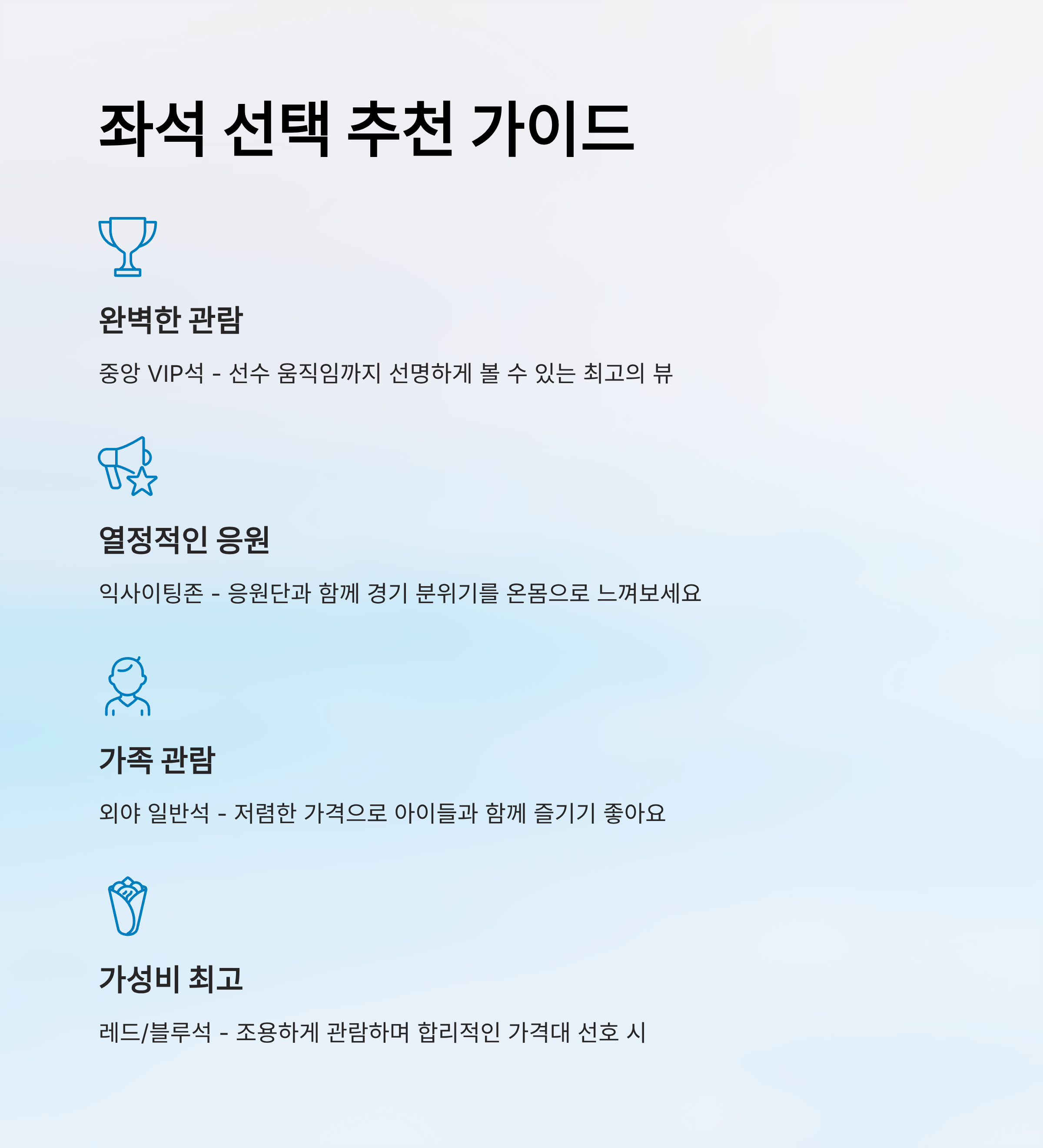 좌석 선택은 예매의 성공뿐 아니라 관람의 만족도를 결정해요! 2025년 KBO 준플레이오프는 좌석이 다양해서, 본인의 관람 스타일에 맞춰 고르는 게 중요하죠.