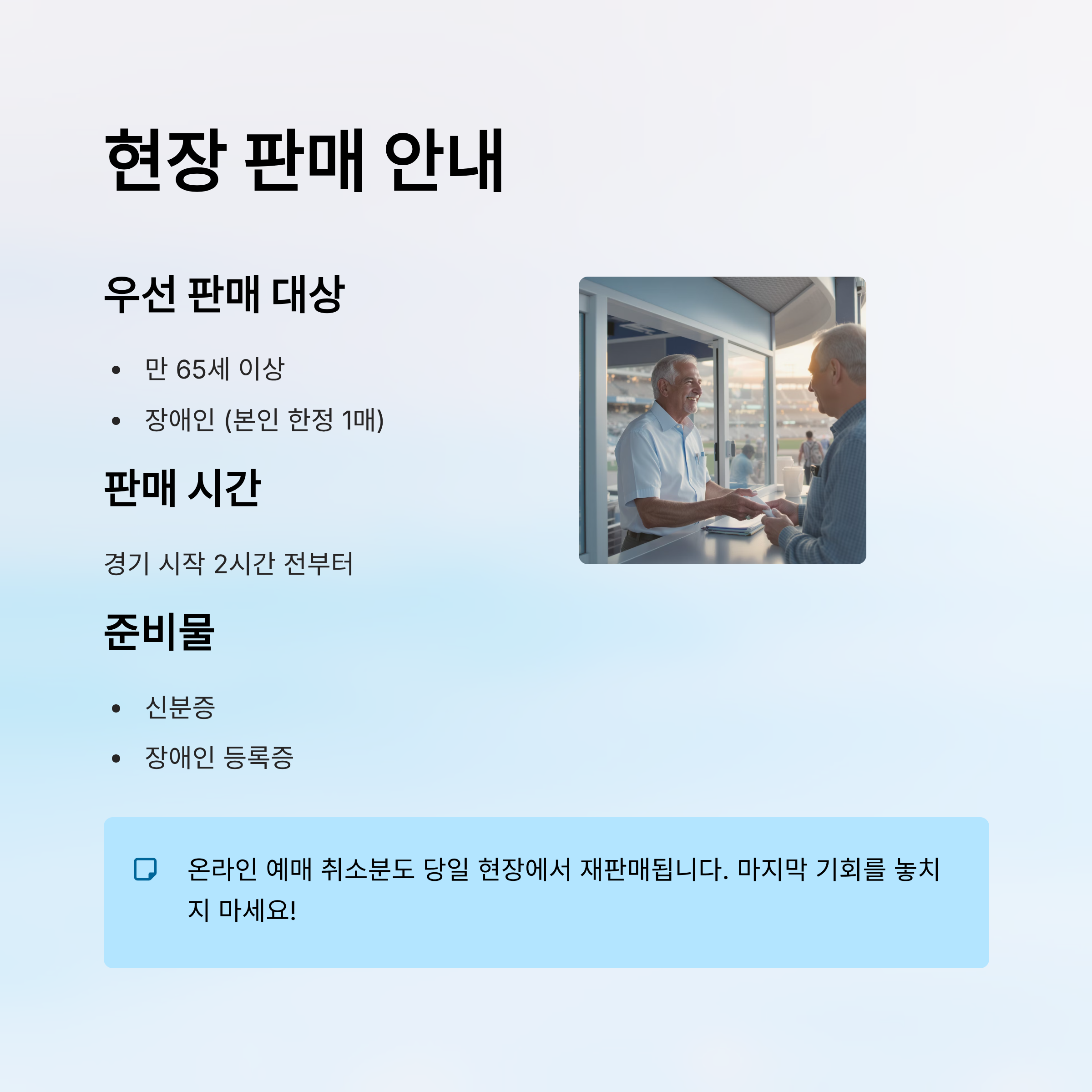디지털 환경에 익숙하지 않거나 스마트폰 사용이 불편한 분들을 위해 경기 당일 현장 판매도 운영돼요. 특히 만 65세 이상이나 장애인을 위한 우선 배려예요.