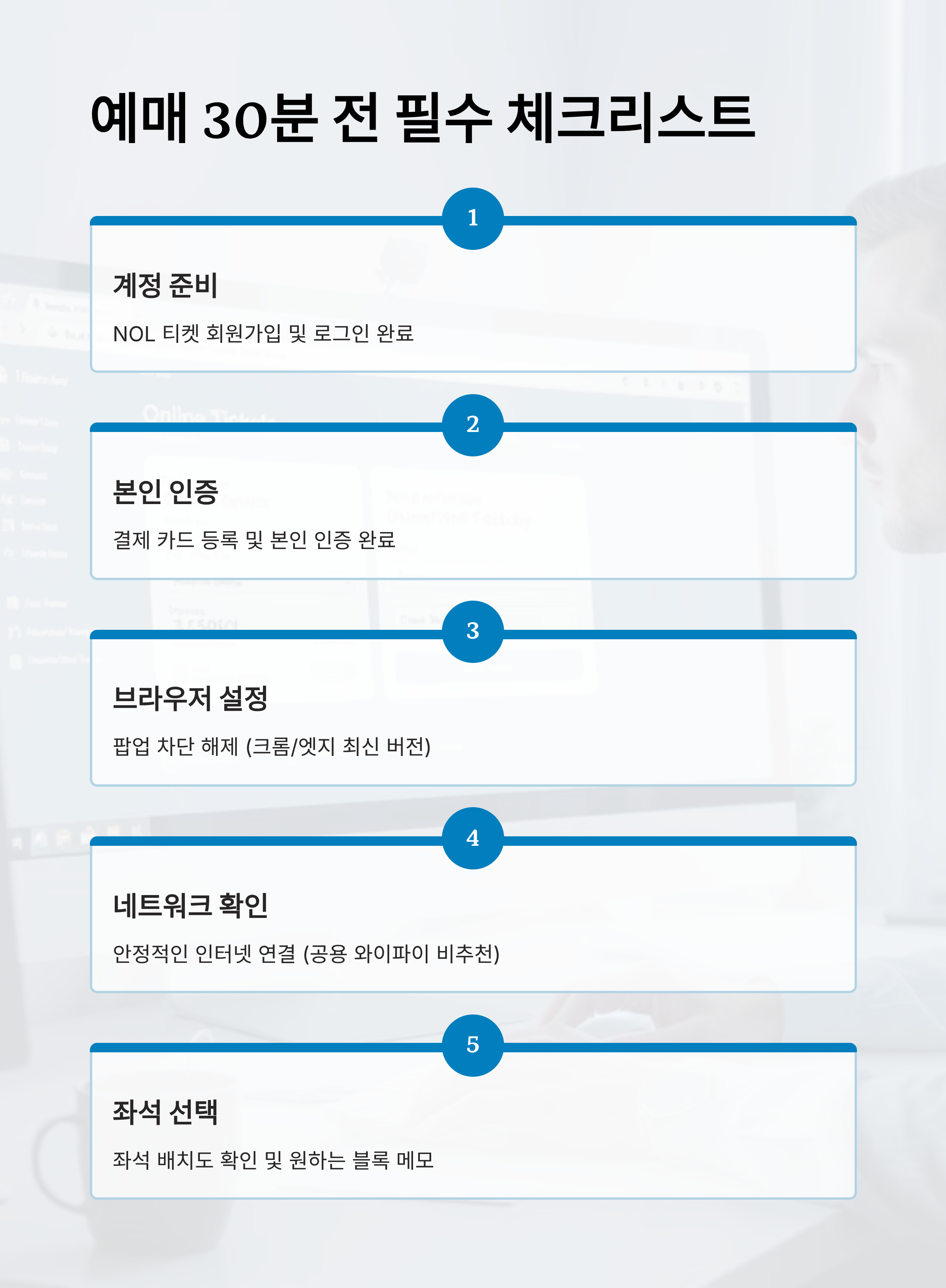 예매 성공은 예매 오픈 ‘30분 전’ 준비로 결정된다고 해도 과언이 아니에요. 그래서 아래 체크리스트를 한눈에 보기 쉽게 정리했어요!