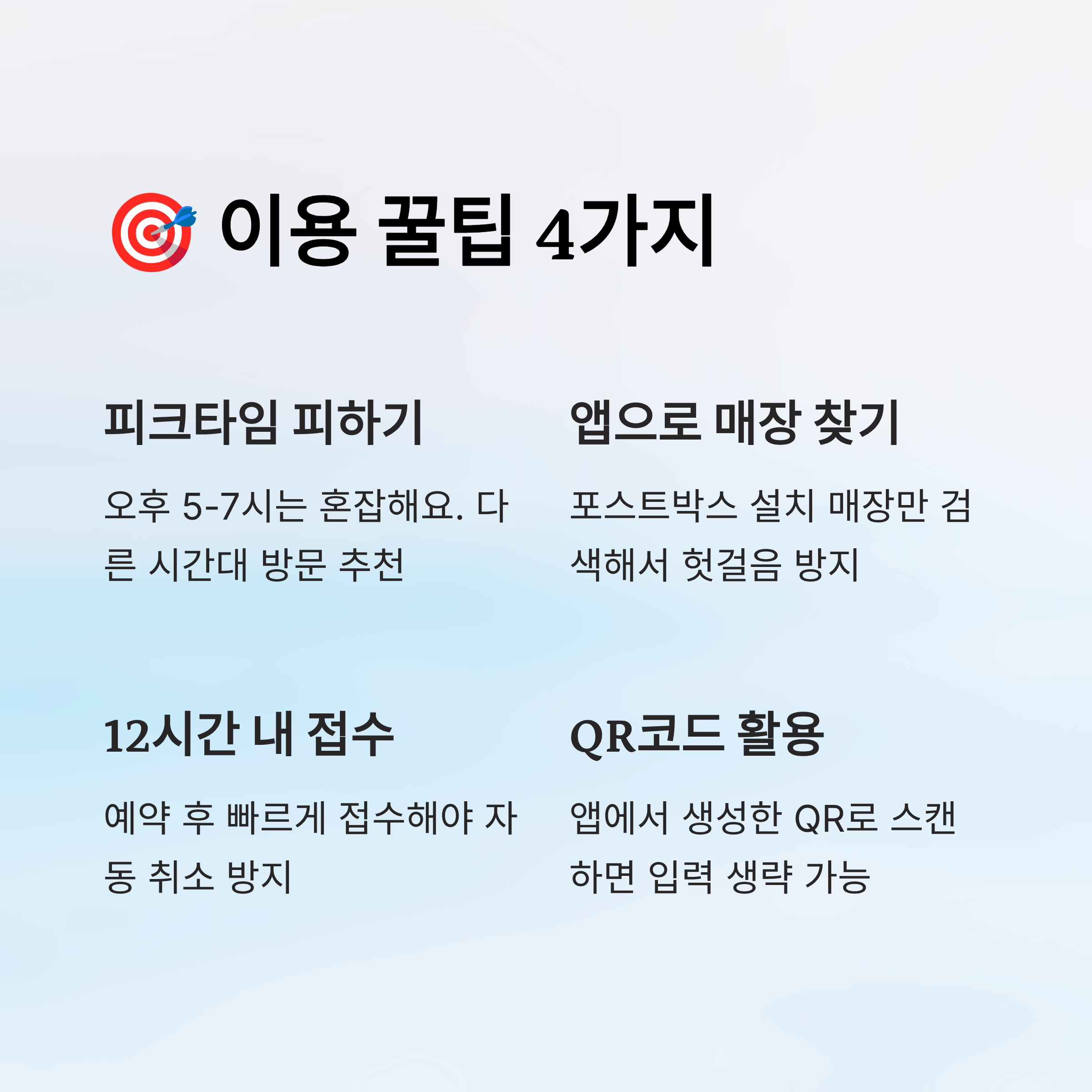 네 번째로는 **QR코드 접수 기능**을 활용하는 거예요. 포스트박스 앱에서 예약한 뒤, QR코드를 생성해서 접수기에 스캔하면 일일이 번호를 입력하지 않아도 자동으로 정보가 불러와져서 훨씬 편리해요! 📱