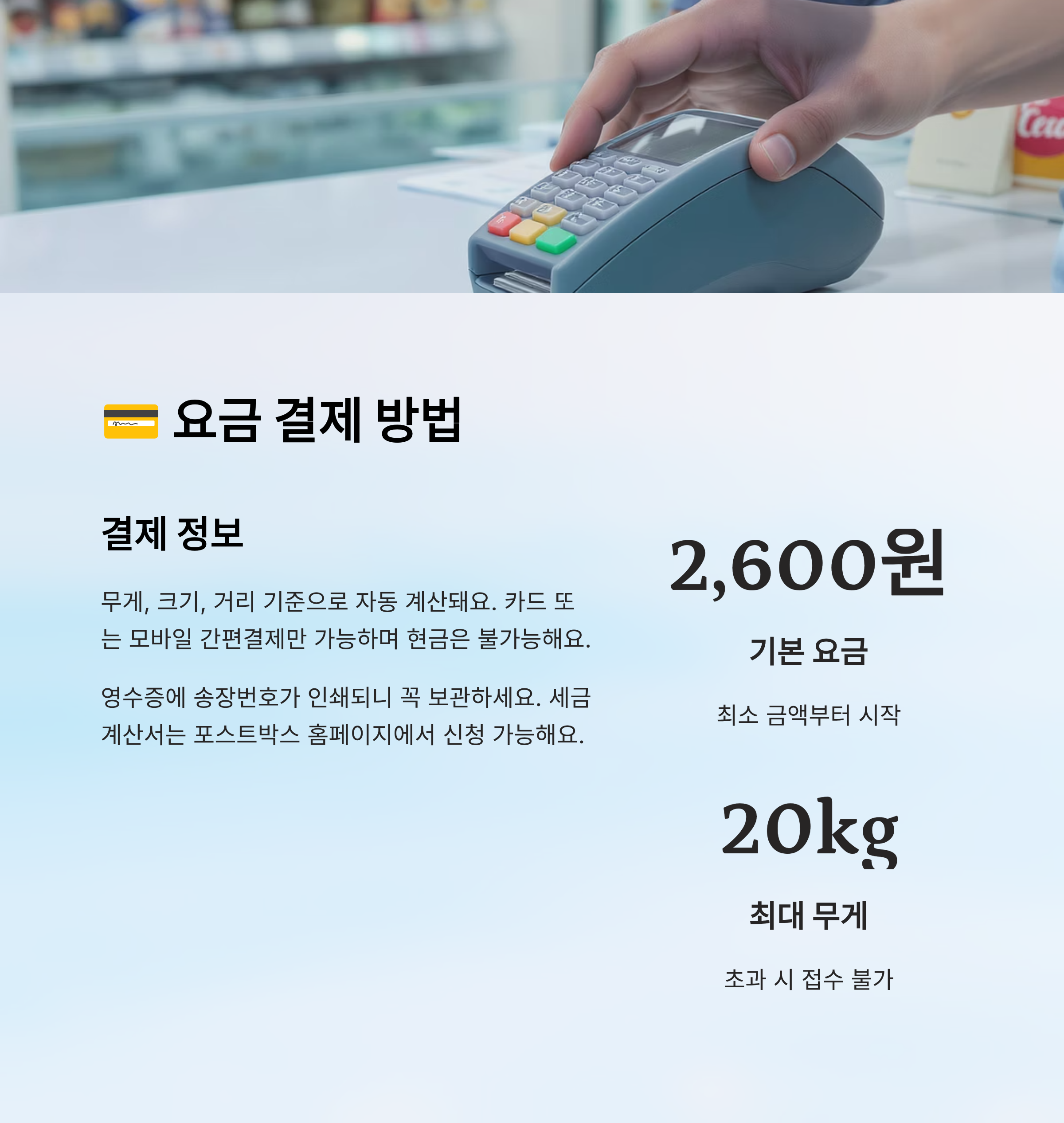 기기에서 송장을 출력하면 동시에 결제 단계로 넘어가요. 결제는 카드 또는 모바일 간편결제로 가능해요. 현금은 불가능한 점 꼭 기억하세요! 간혹 간편결제가 먹통일 수 있으니 실물 카드도 챙겨가면 좋아요.