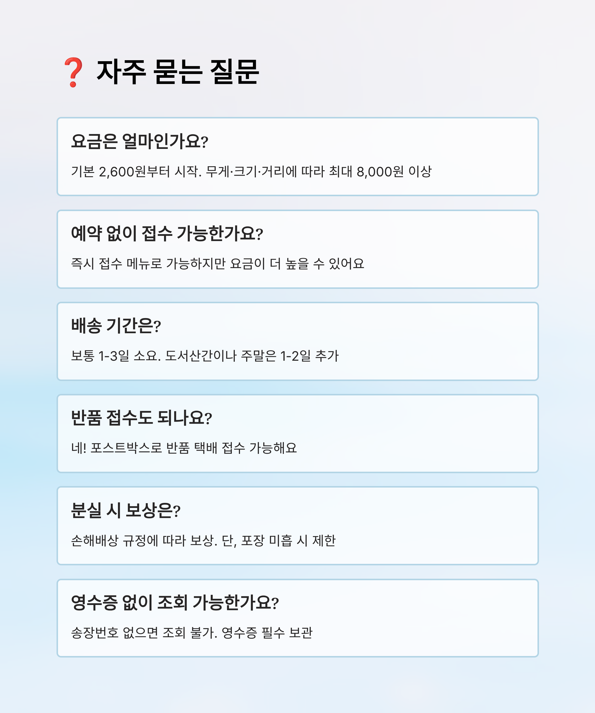A1. 기본 요금은 2,600원부터 시작하며, 무게·크기·거리 기준에 따라 8,000원 이상까지도 나올 수 있어요.